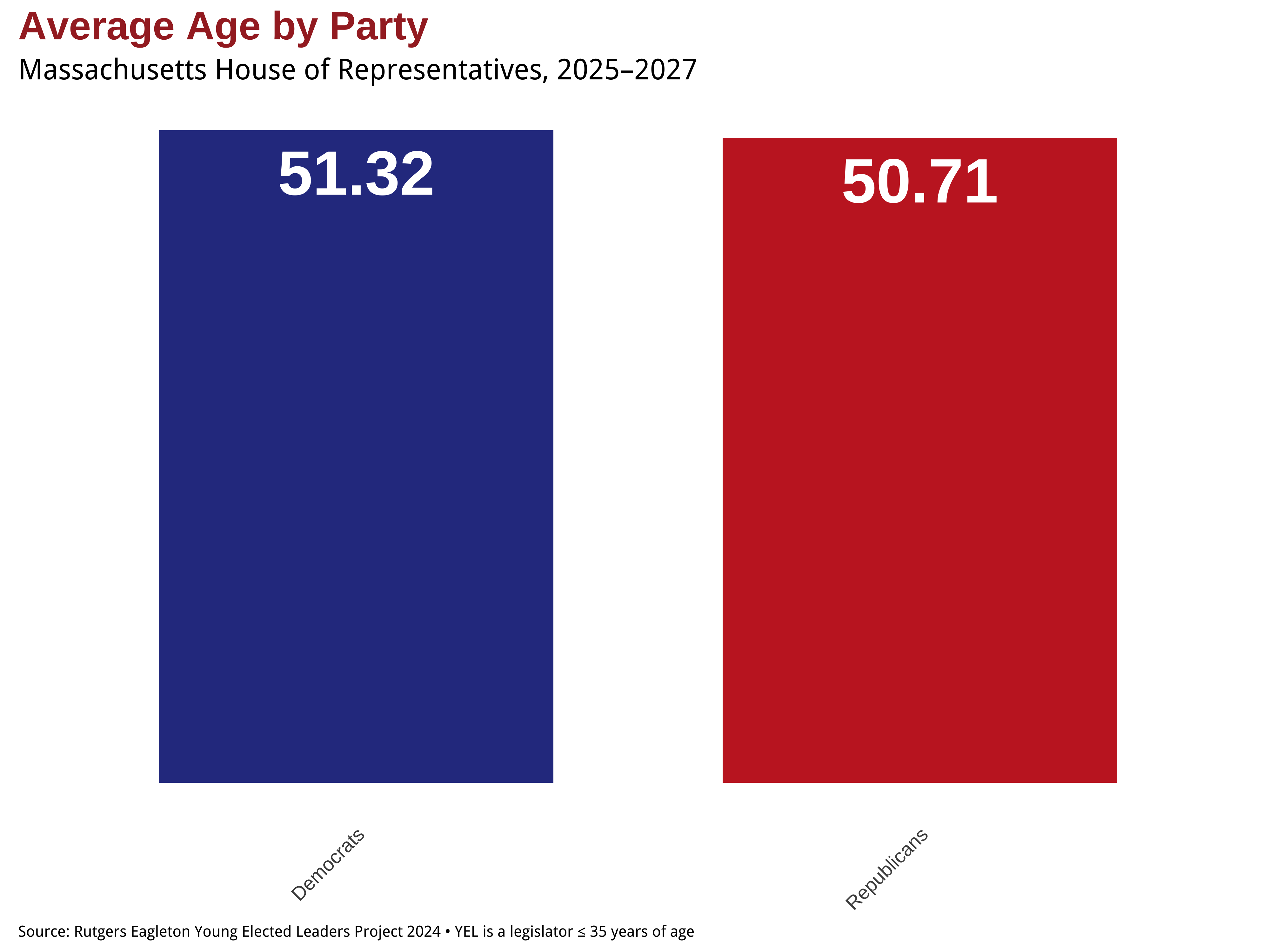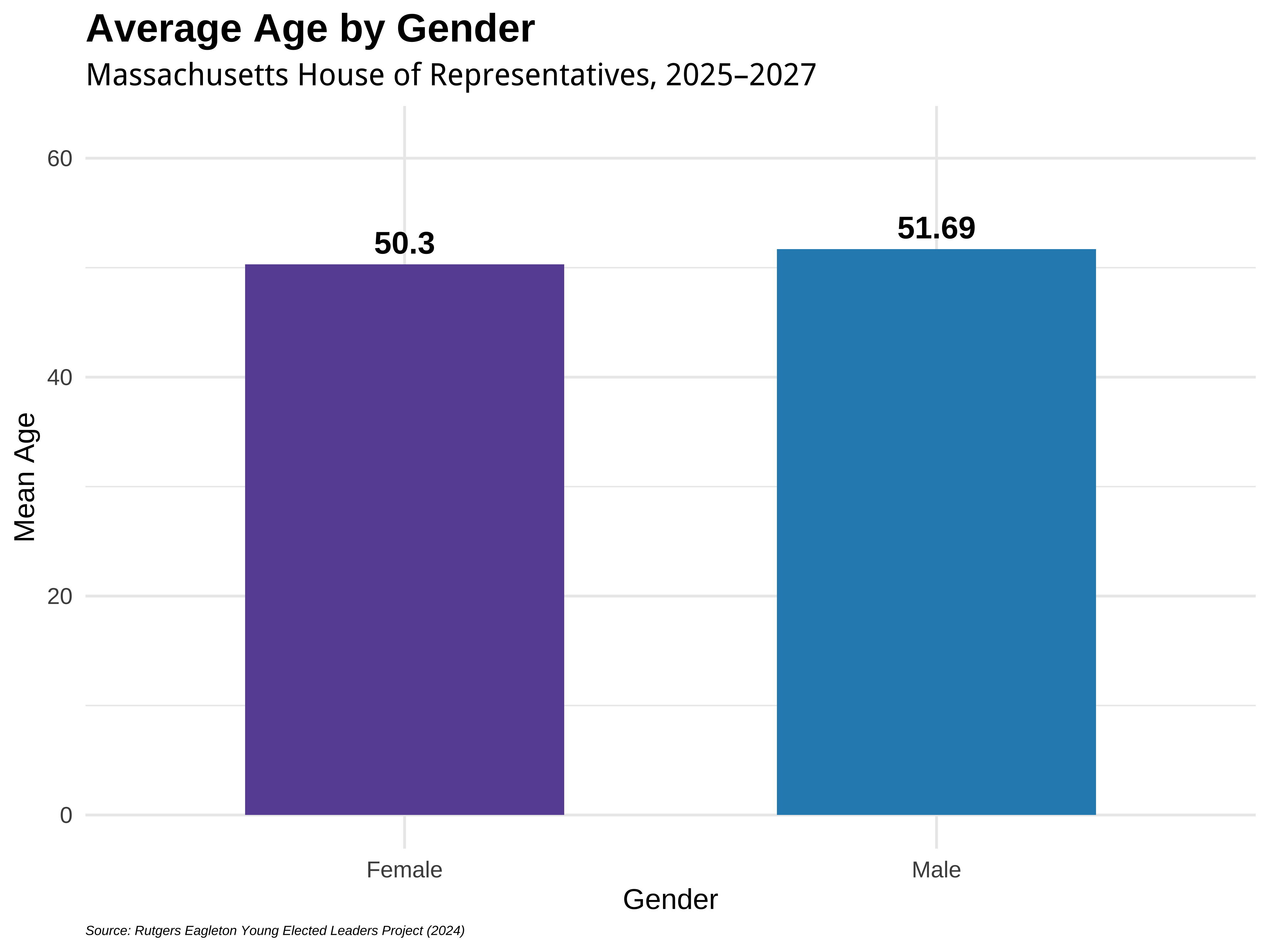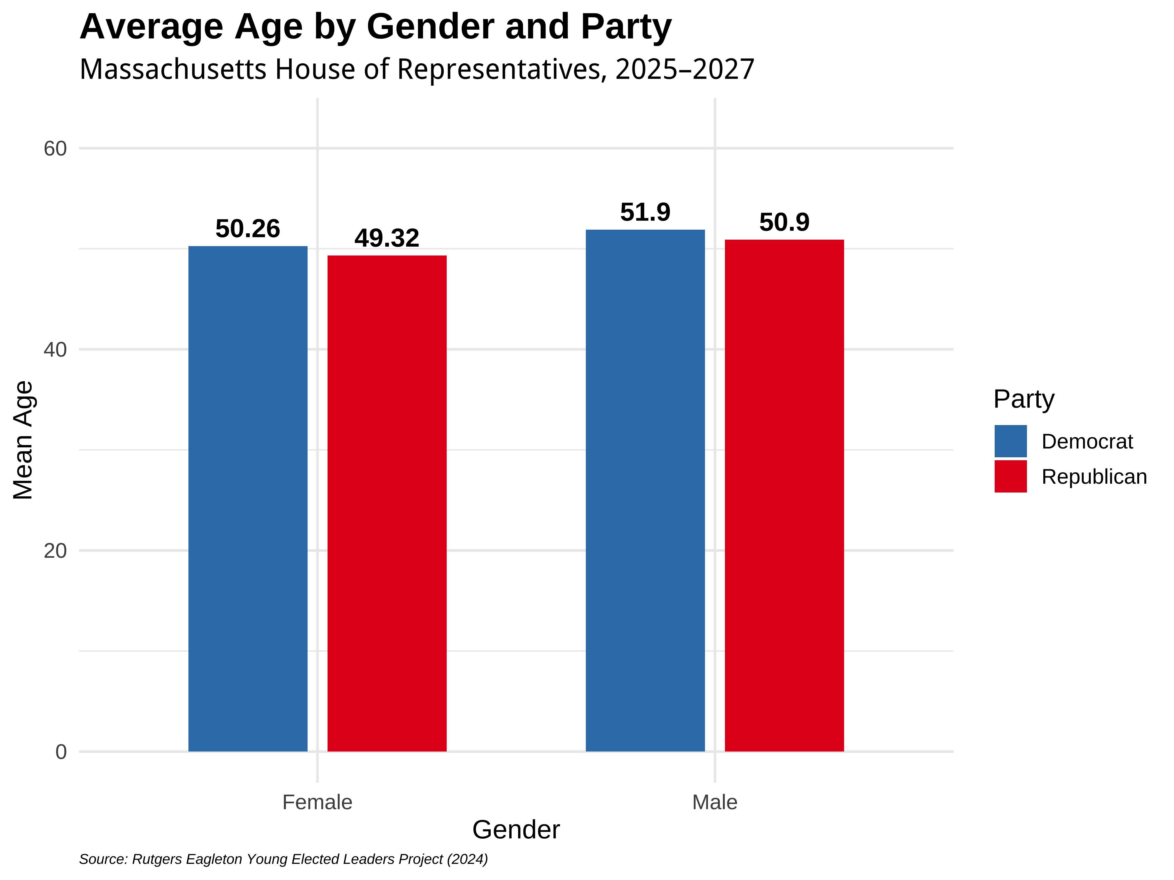 Partisan dynamics in the Massachusetts House of Representatives reflect not only ideological differences but also generational contrasts. The visual below highlights one key distinction: the average age of legislators by party. Overall in the Massachusetts House of Representatives both parties have identical average ages, both over 50 years old respectively. Differences in average ages may reflect broader trends in political recruitment, generational turnover, and candidate emergence in recent election cycles.