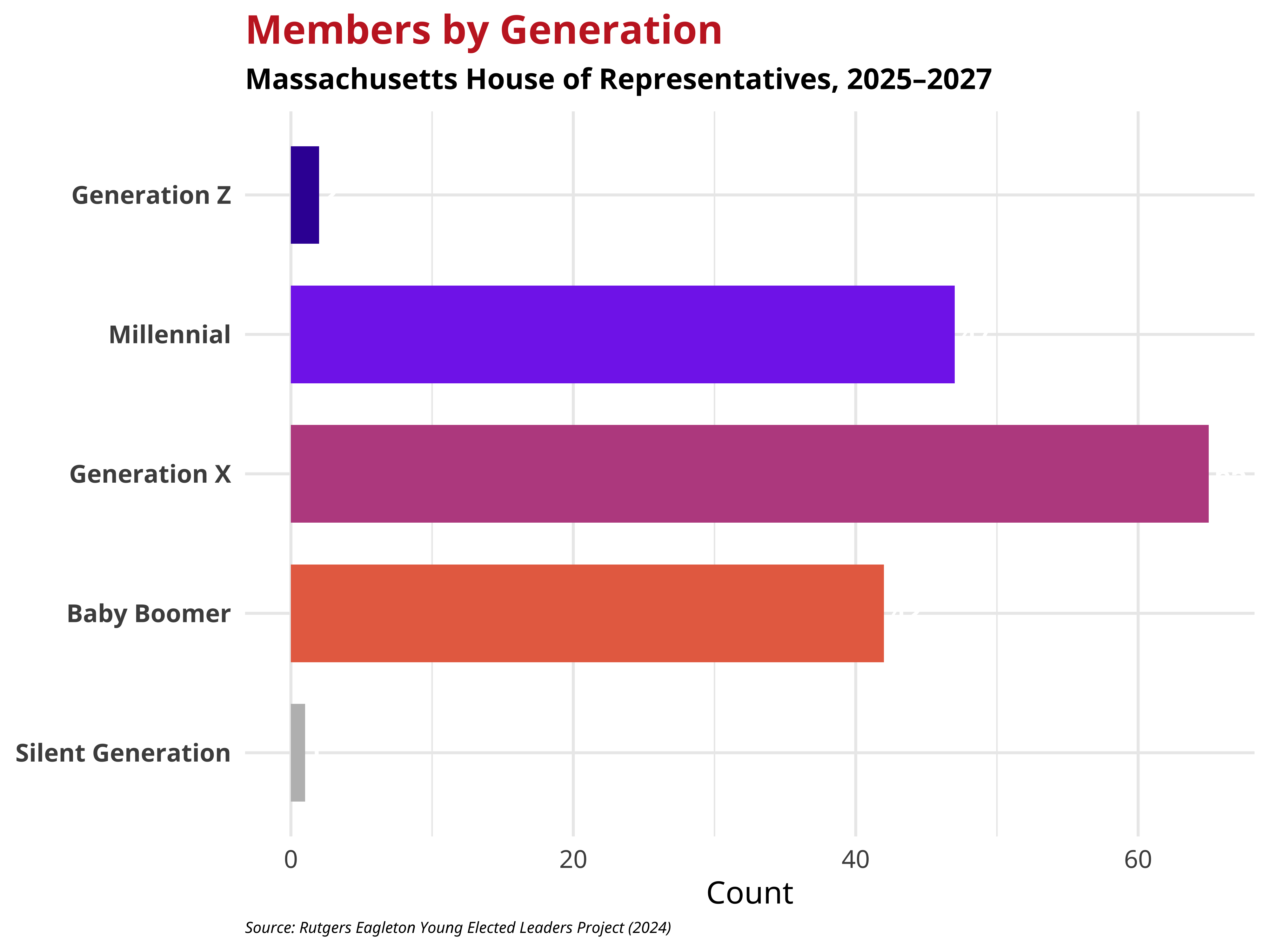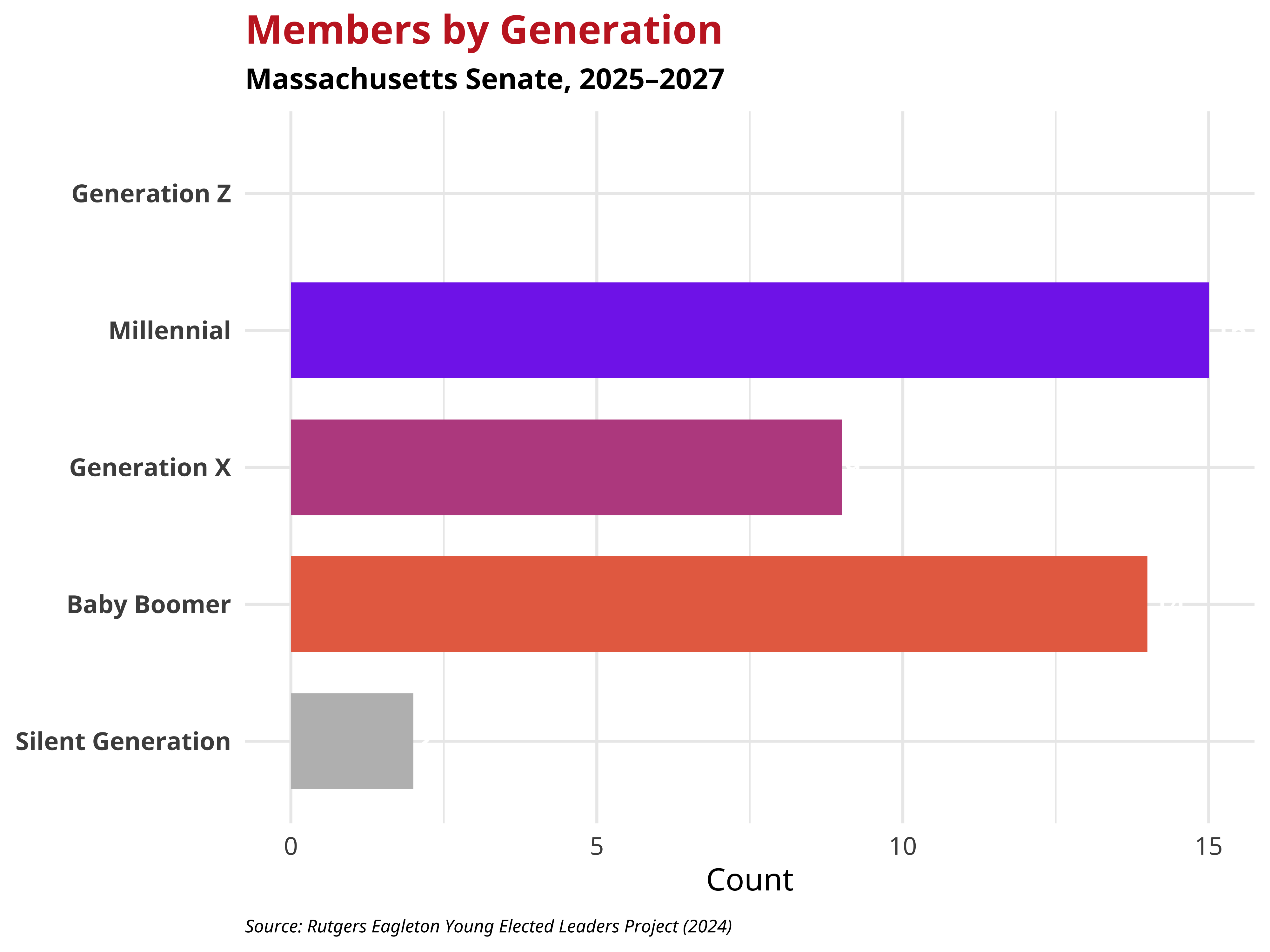 The racial and ethnic composition of the Massachusetts Senate shows generational variation. The table below presents the distribution by generation.
