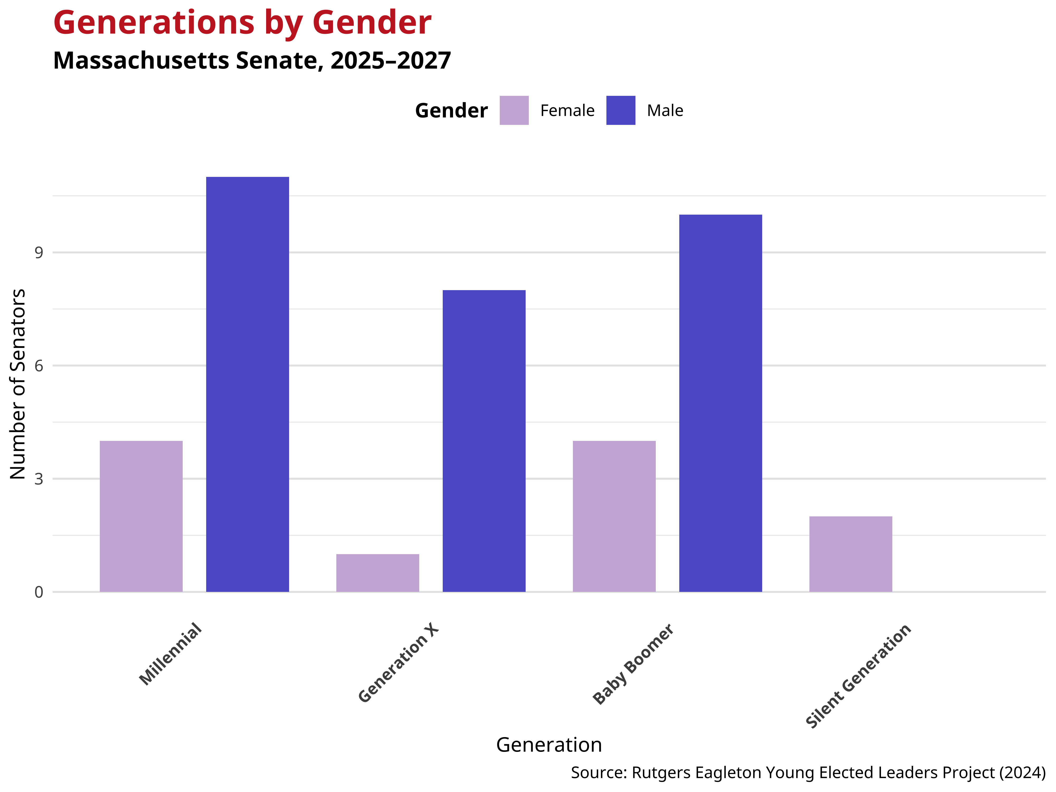 The generational makeup of the Massachusetts Senate reveals notable gender dynamics. Overall, men outnumber women, across Millennial, Generation X, Baby Boomer senators. These patterns indicate that gender representation varies across generations, with women present in every age cohort but often in smaller numbers than men.
