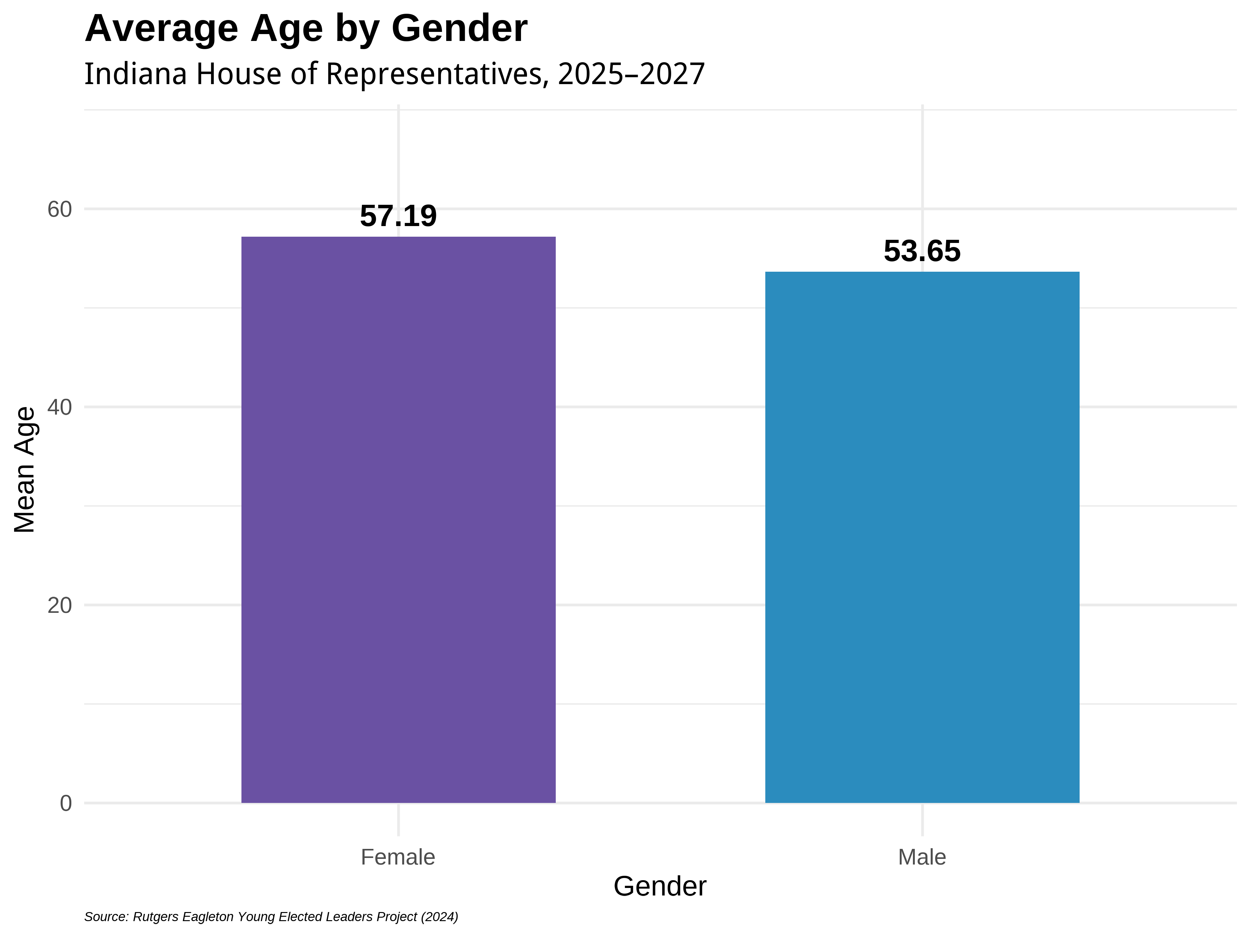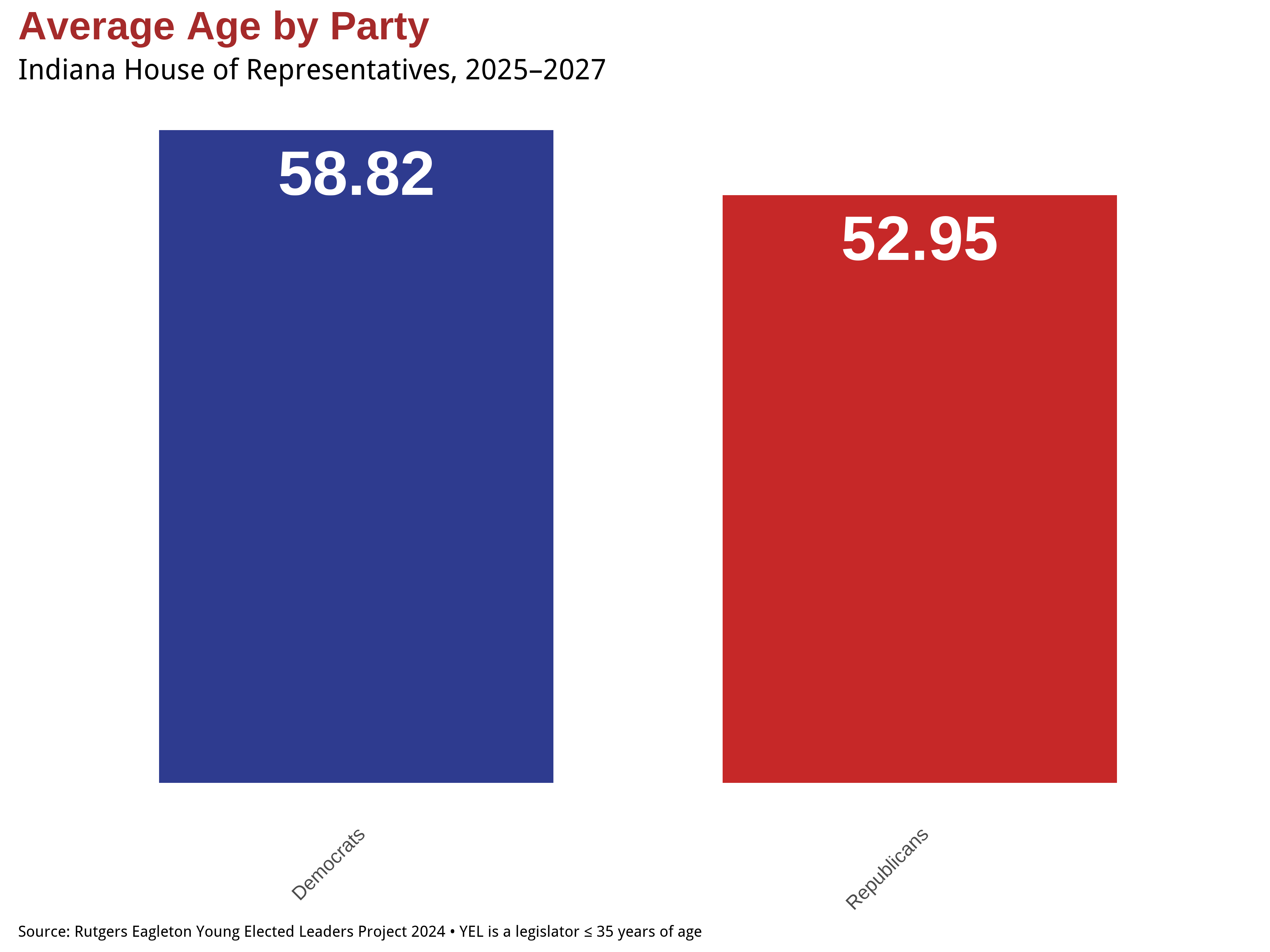 Partisan dynamics in the Indiana House of Representatives reflect not only ideological differences but also generational contrasts. The visual below highlights one key distinction: the average age of legislators by party. While both parties include a mix of experience levels, Democratic members are, on average, older than their Republican counterparts. This difference may reflect broader trends in political recruitment, generational turnover, and candidate emergence in recent election cycles.