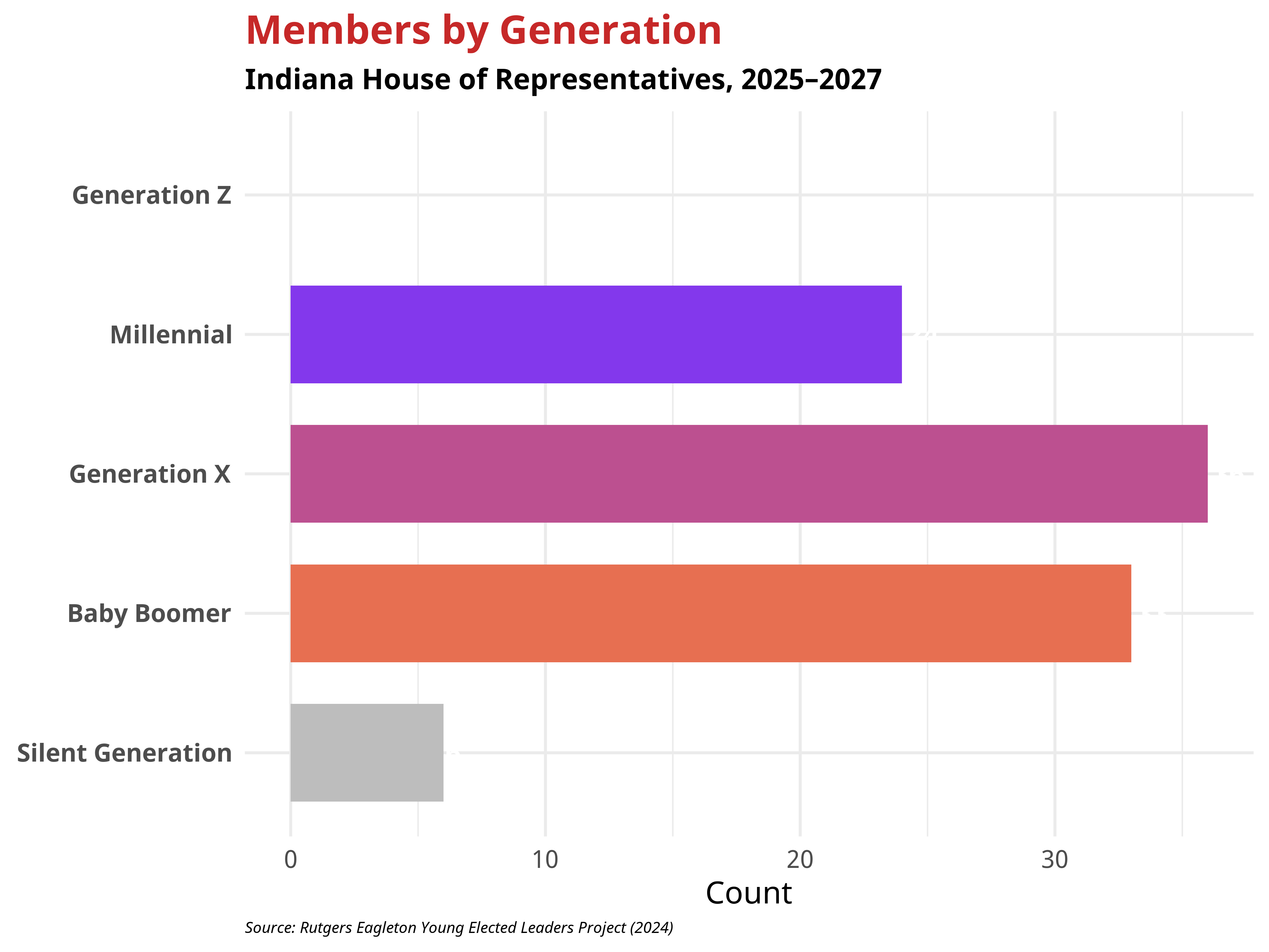Within the Indiana House of Representatives, most representatives come from the Millennial, Generation X or The Baby Boomer generation. Importantly, no members of the current Indiana House of Representatives belong to Generation Z. Scroll below to see the generations in the Indiana House of Representatives visualized.