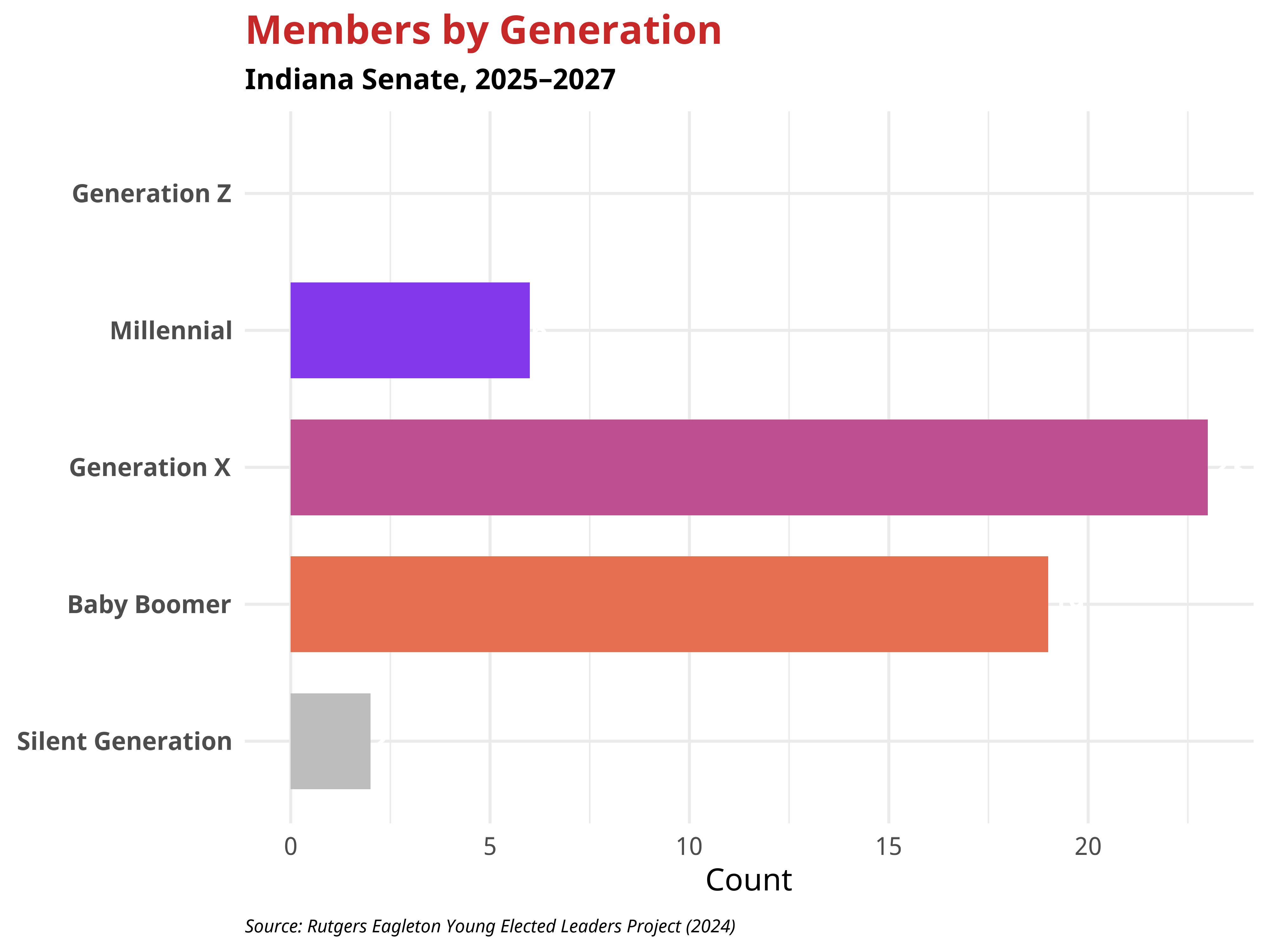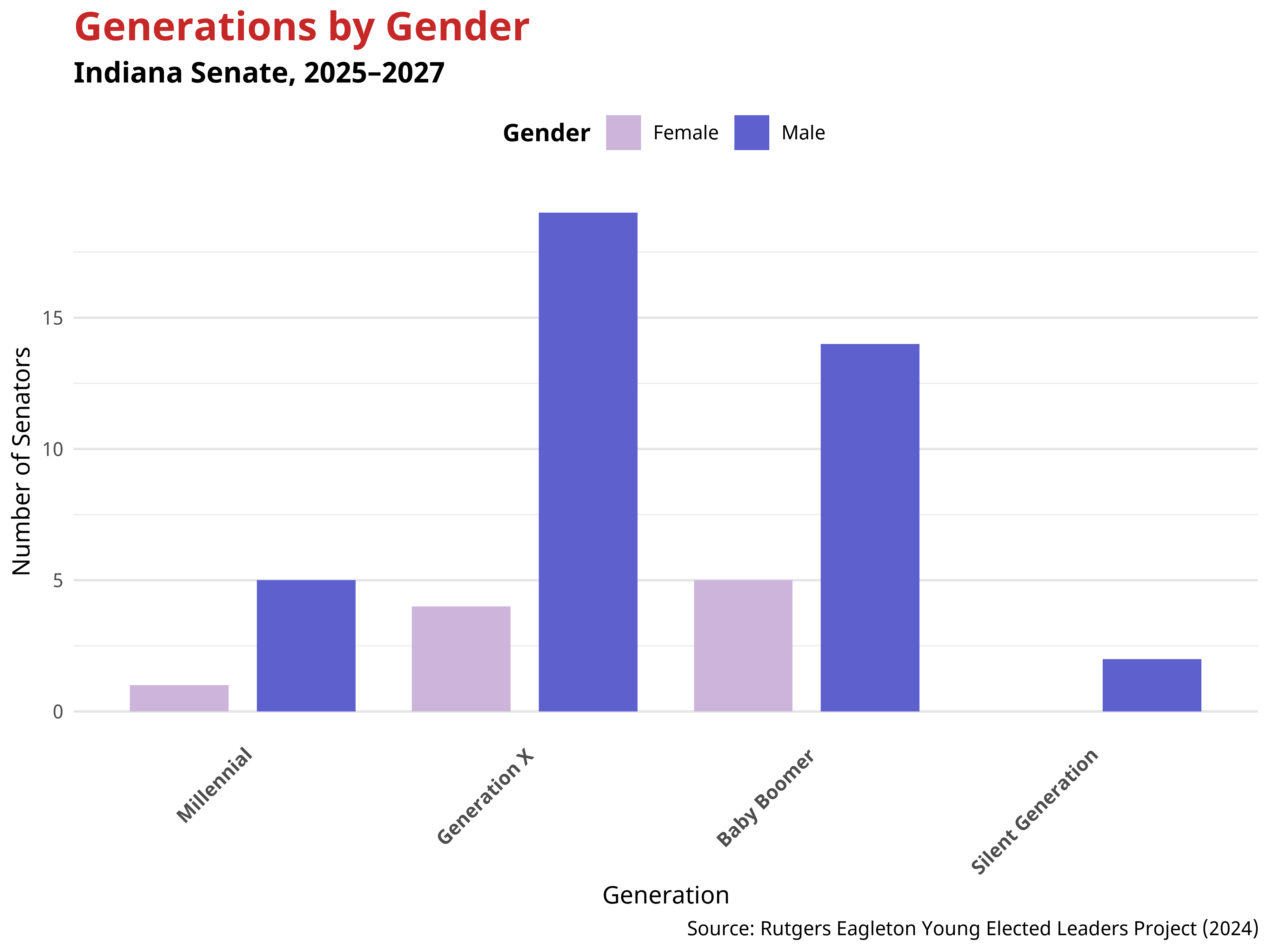 The generational makeup of the Indiana Senate also reflects important gender dynamics. Across generations, gender balance is more male skewed across generations. Overall more men are represented than women among both Millennial and Generation X members. While among Baby Boomers women are more represented than men. These patterns suggest that gender balance varies across generational lines, with women represented in each age cohort of the Indiana Senate.