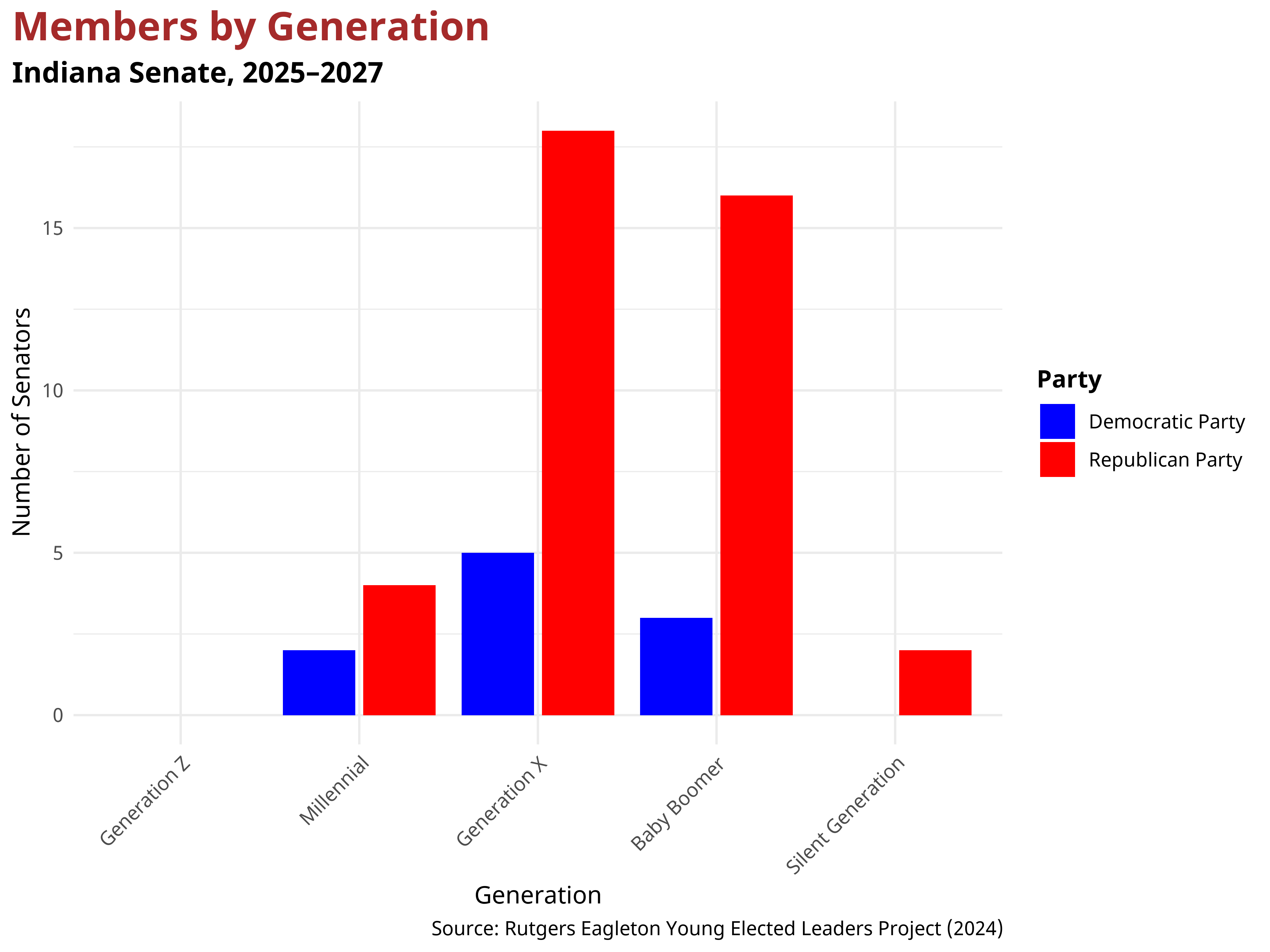 In the Indiana State Senate, 40 senators belong to the Republican Party, 10 senators are Democrats. The mean age of Republican state senators after the 2024 election was 59.95, while the mean age of Democratic state senators was 53.75. Each generation had a different partisan makeup. Below is the breakdown of party composition for each generation within the Indiana State Senate.