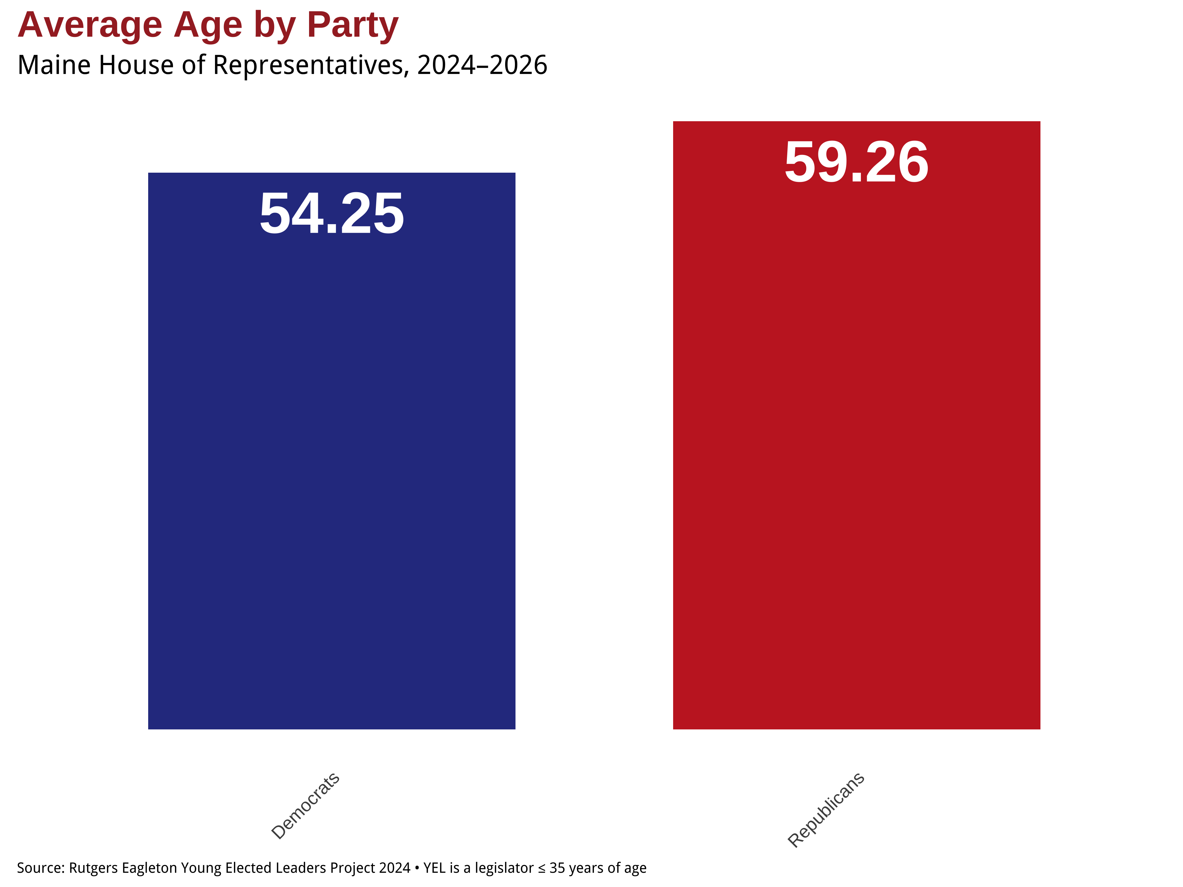 The Maine House of Representatives reflects a range of age and gender dynamics that help shape the composition of the state’s legislative body. Across all members, 57.14% are men, while women make up the remaining 41.56%. Men have a higher mean age than women with the current Maine House. For male representatives there was an average age of 58.35 at the time of the election, compared to 53.98 for their female colleagues. Of the the 13 Young Elected Leaders, 7 are female and 6 are male.
