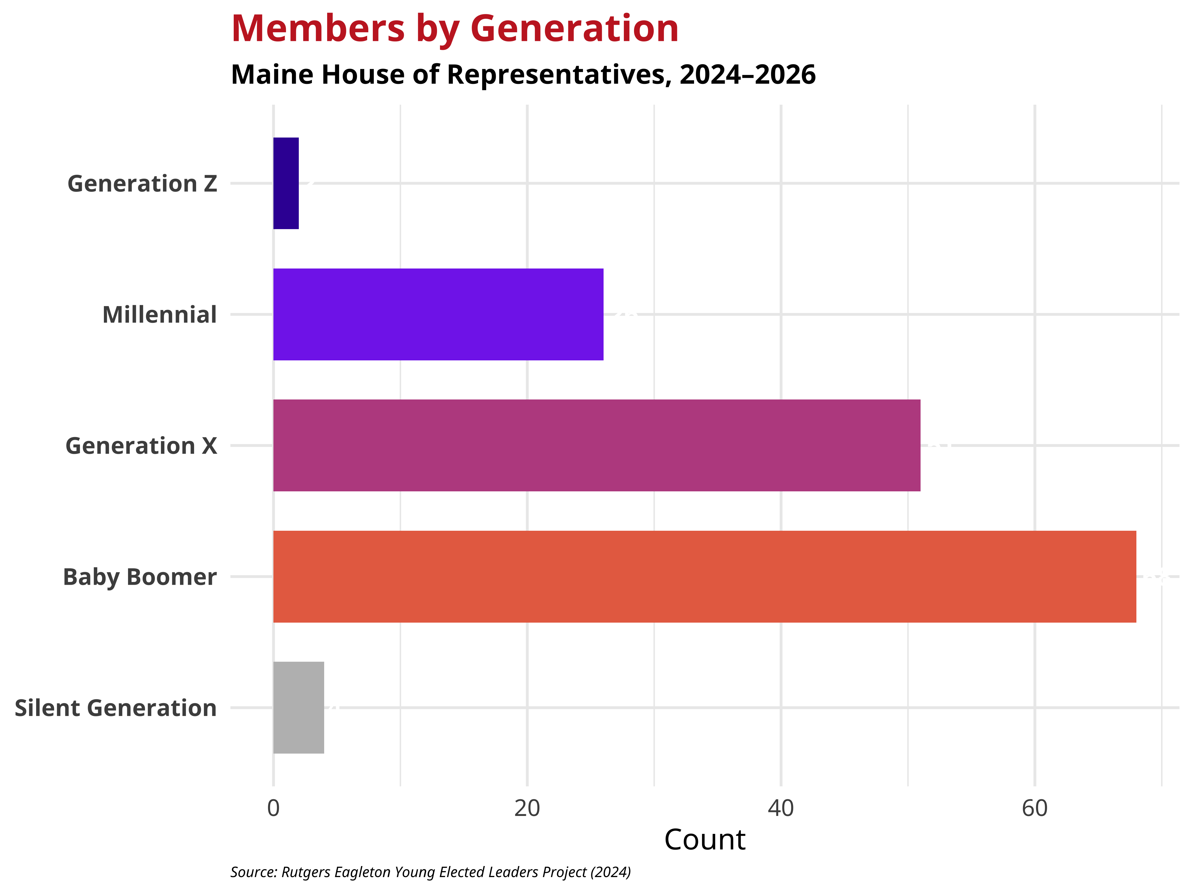 The racial and ethnic composition of the Maine House varies across generations. In 2024, younger cohorts show modestly more diversity, though the chamber overall remains majority White. The table below shows each generation’s distribution.