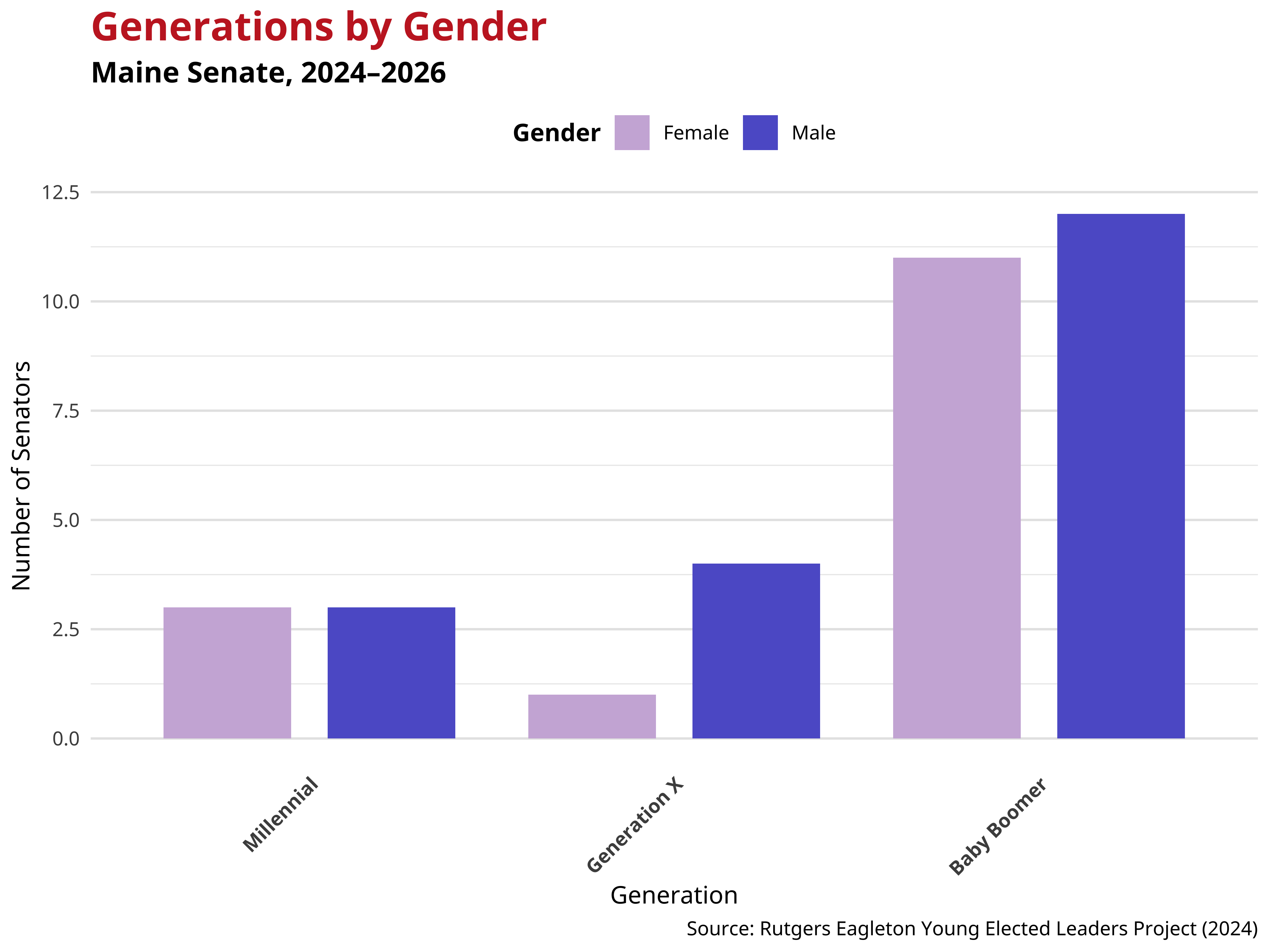 The generational makeup of the Maine Senate reveals notable gender dynamics. Overall, men outnumber women, particularly among Generation X and Baby Boomer senators. Millennials, however, maintain an equal gender balance. These patterns indicate that gender representation varies across generations, with women present in every age cohort but often in smaller numbers than men.