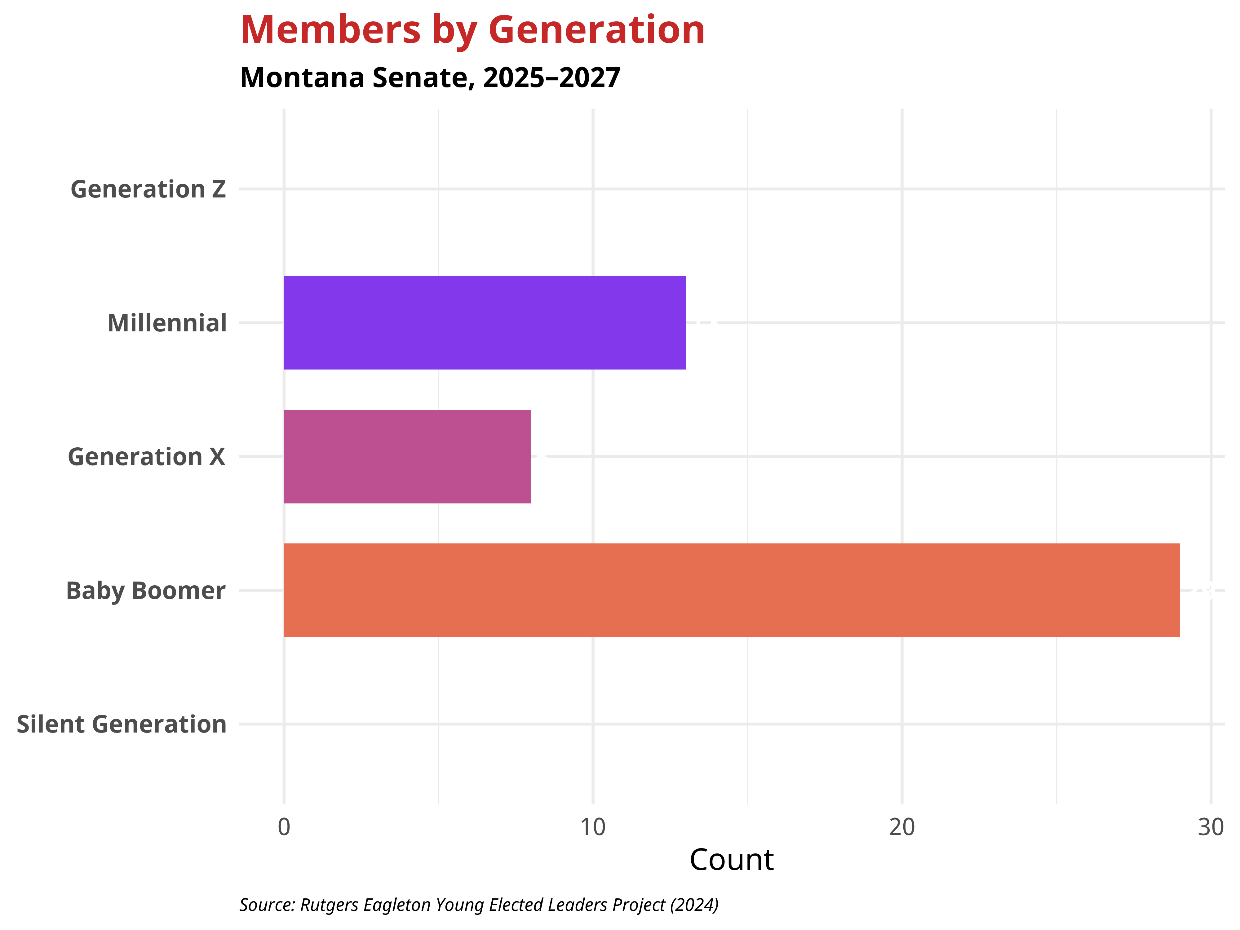 The racial and ethnic composition of the Montana Senate shows generational variation. The table below presents the distribution by generation.