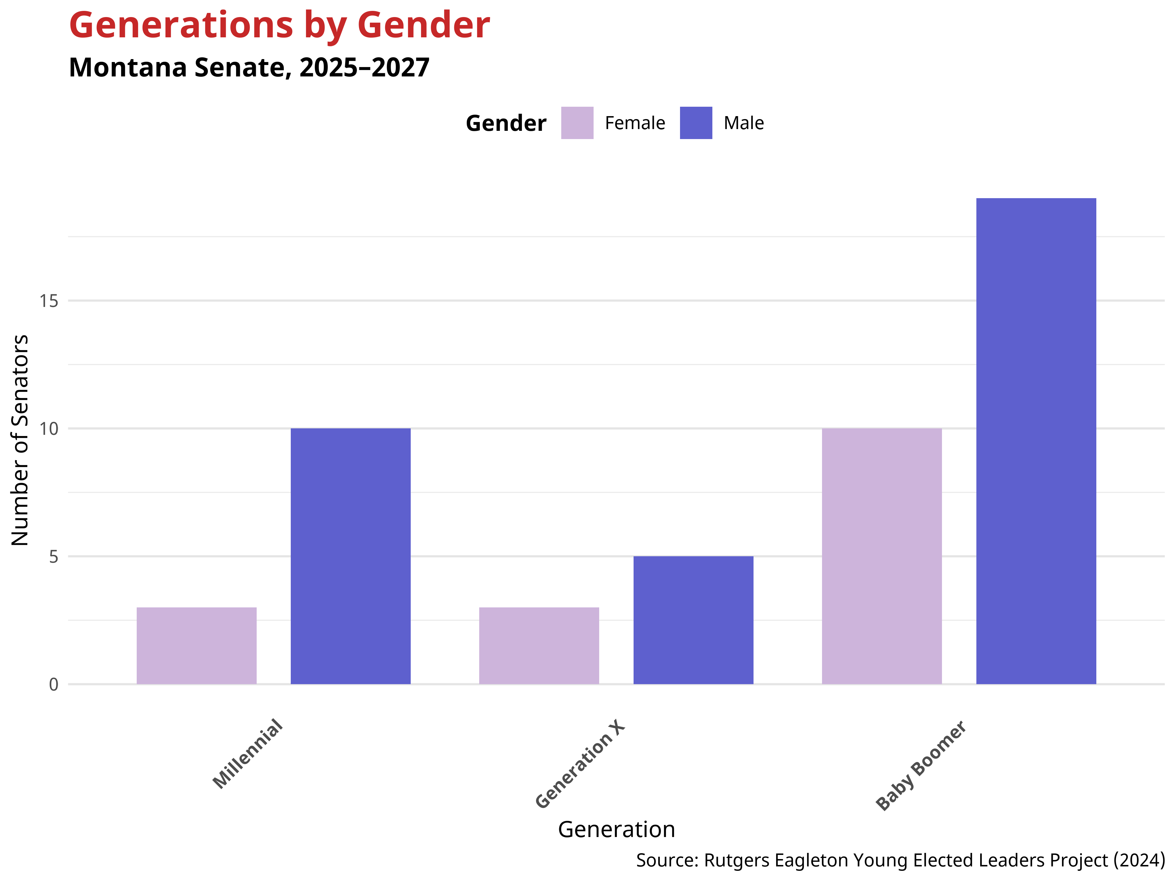The generational makeup of the Montana Senate reveals notable gender dynamics. Overall, men outnumber women, across Millennial, Generation X, and Baby Boomer senators. These patterns indicate that gender representation varies across generations, with women present in every age cohort but often in smaller numbers than men.