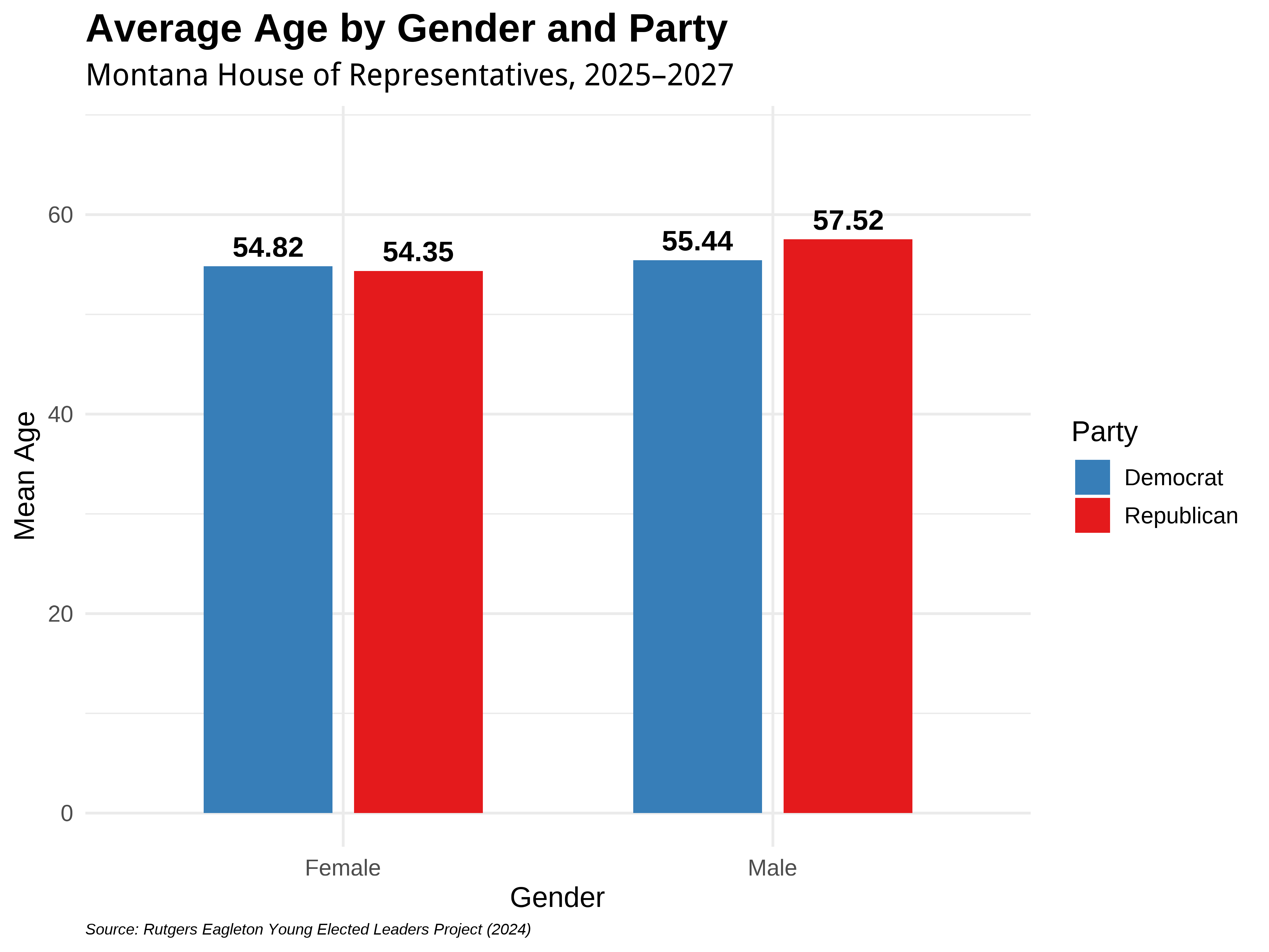 When examining both gender and party affiliation, additional differences in age emerge within the Montana House of Representatives. Republican women have the lowest average age of all four groups at 54.35, while Democratic women have a higher average age of 54.82. For men in the Montana House of Representatives, both Democrats and Republicans are on average older, with Democratic men averaging 55.44 and Republican men averaging the highest age among these groups at 57.52. These patterns show that age representation in the Montana House of Representatives varies by both gender and partisan alignment, highlighting differing pathways to political office across demographic groups.