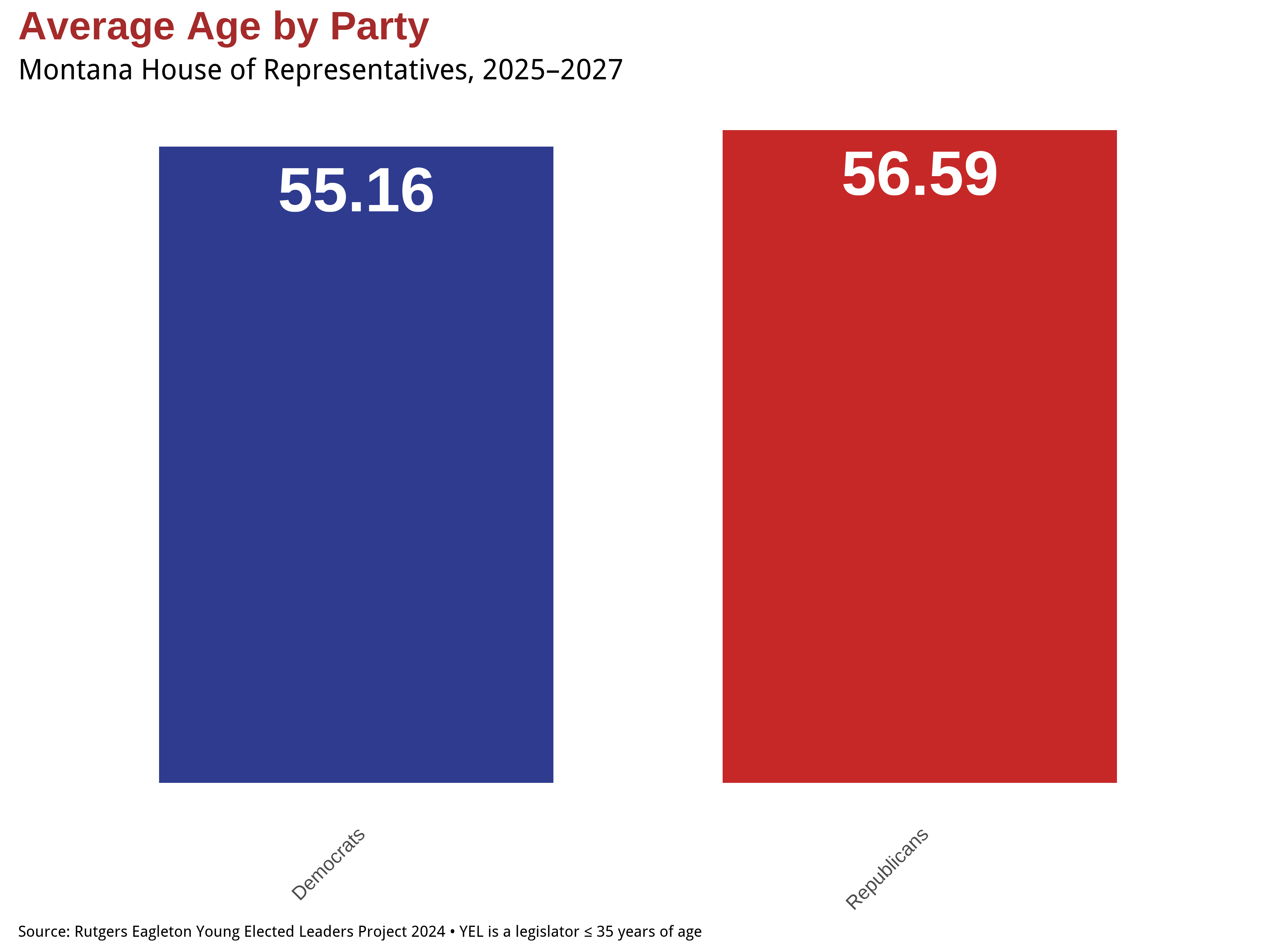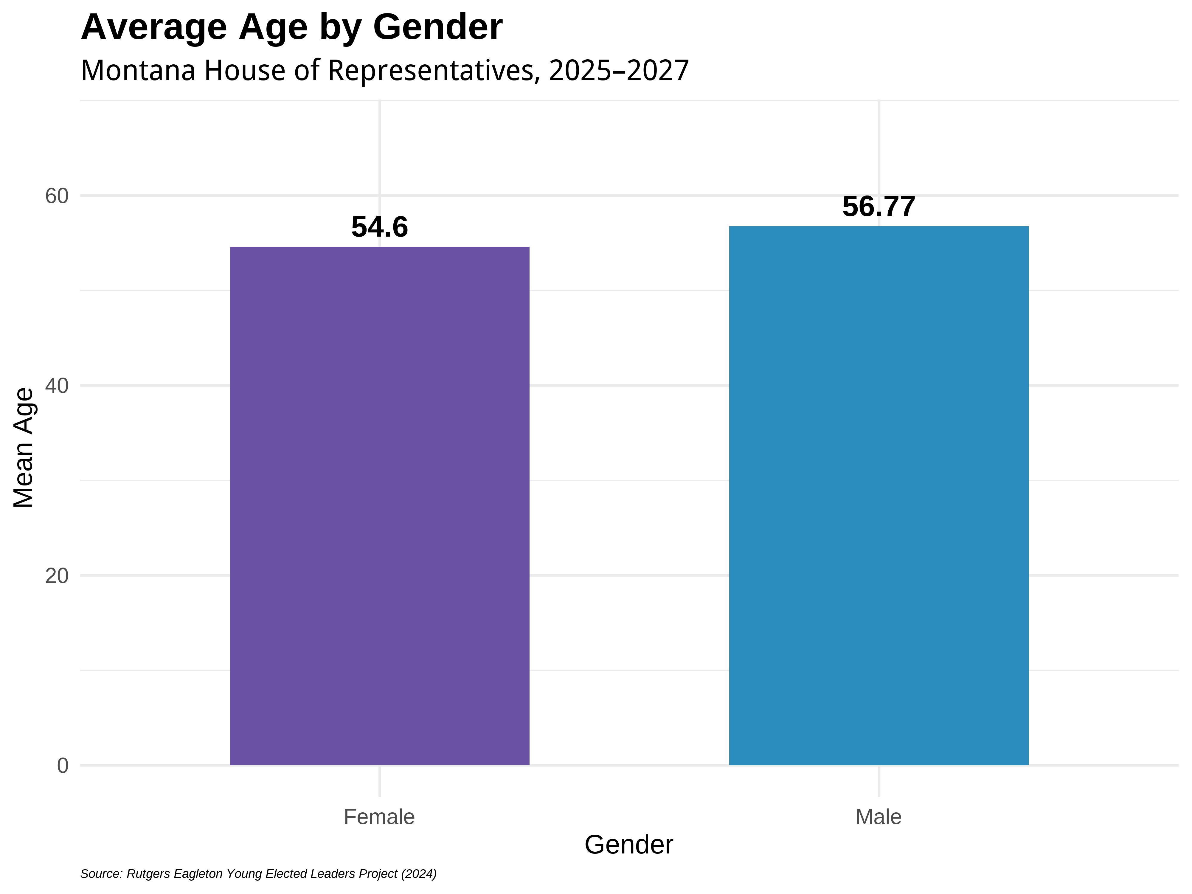 Partisan differences in the Montana House of Representatives extend beyond ideology to include notable generational contrasts. As shown in the visual below, Republican legislators have a higher average age than their Democratic counterparts—56.59 years compared to 55.16 years—a gap of 1.43 years. These disparities may reflect broader patterns in political recruitment, generational turnover, and the types of candidates emerging in recent election cycles.