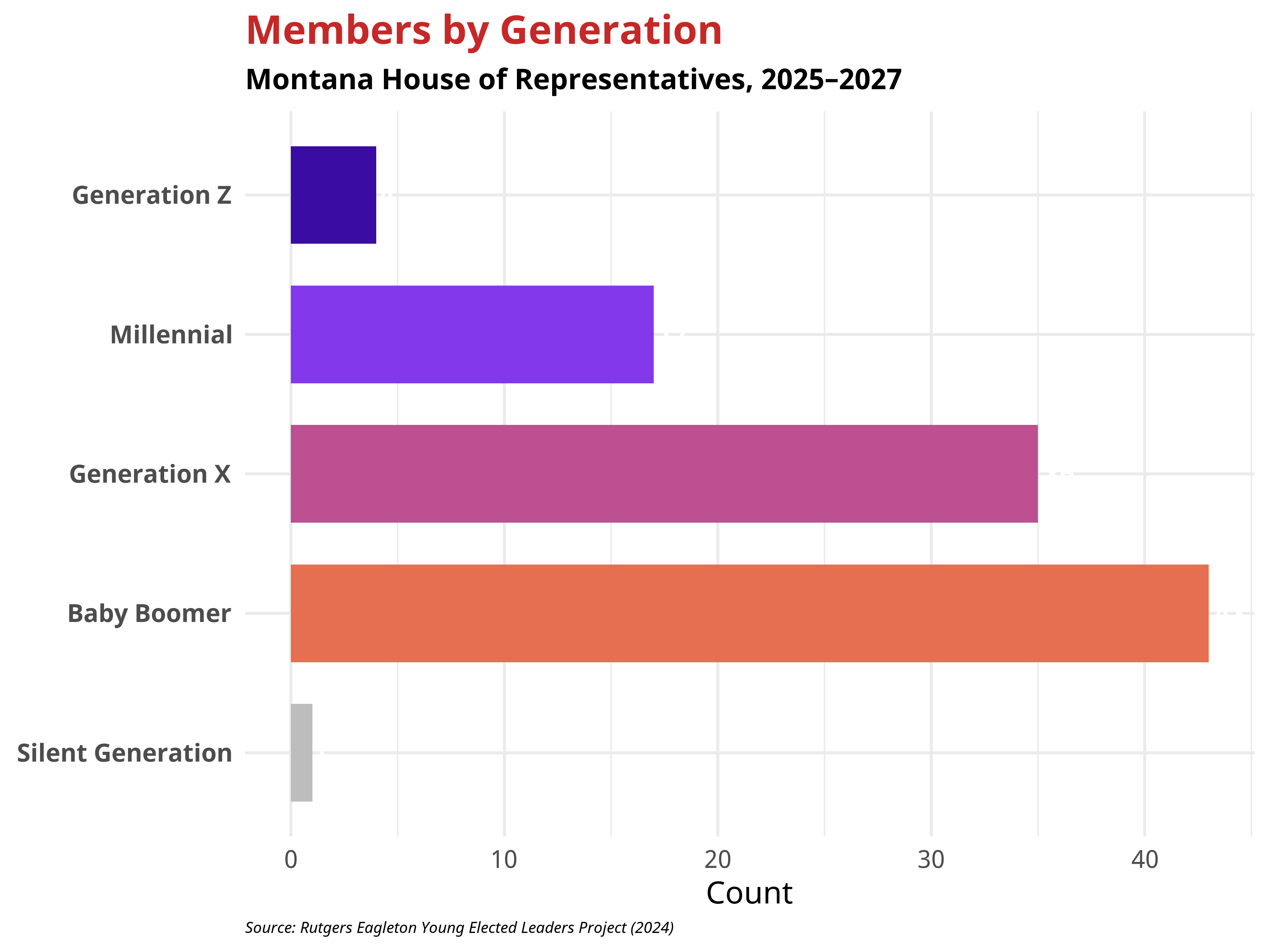 Within the Montana House of Representatives, most representatives come from the Millennial, Generation X or The Baby Boomer generation. Importantly, several members of the current Montana House of Representatives belong to Generation Z. Scroll below to see the generations in the Montana House of Representatives visualized.