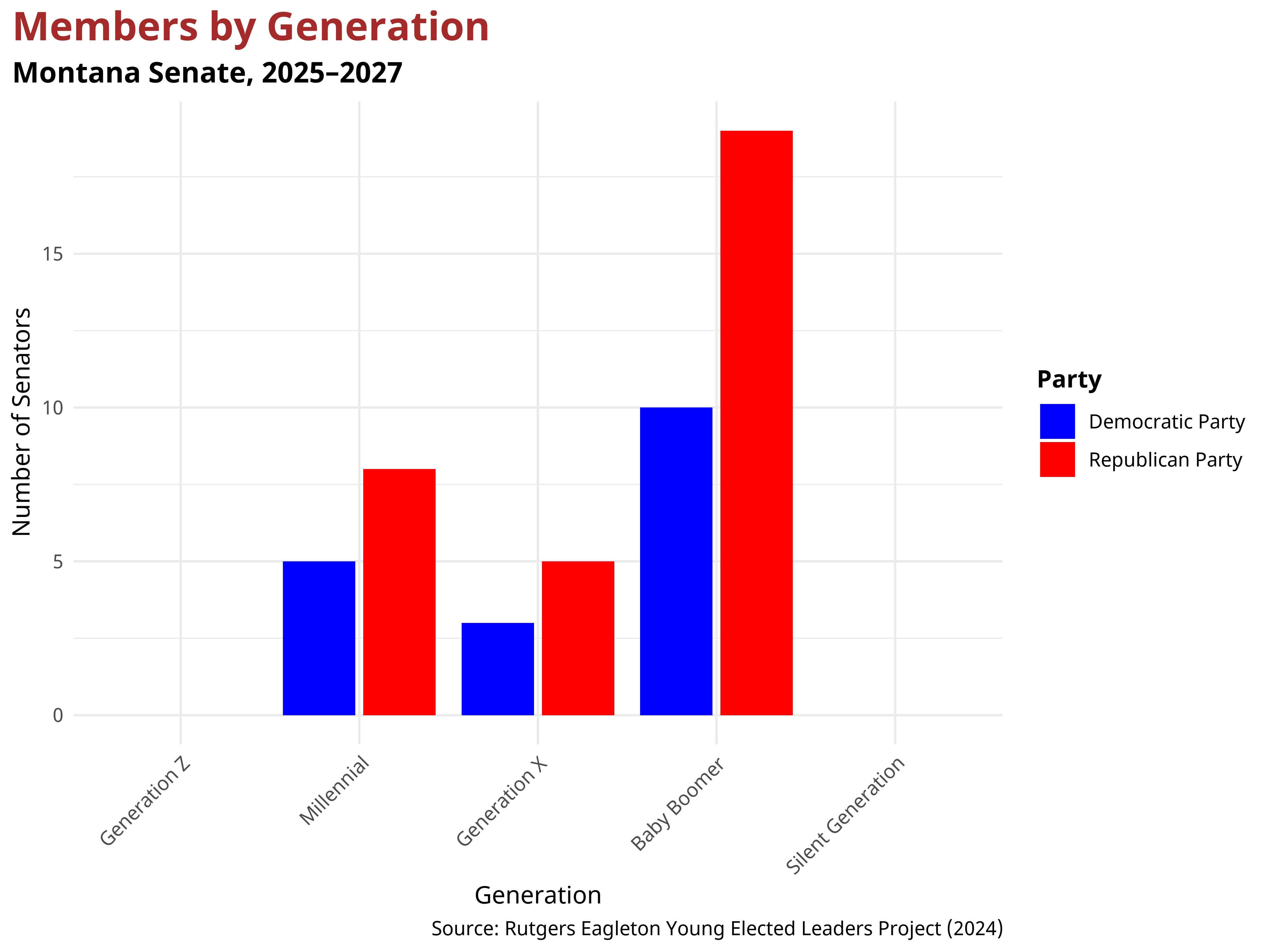 The racial and ethnic composition of the Montana Senate shows generational variation. The table below presents the distribution by generation.
