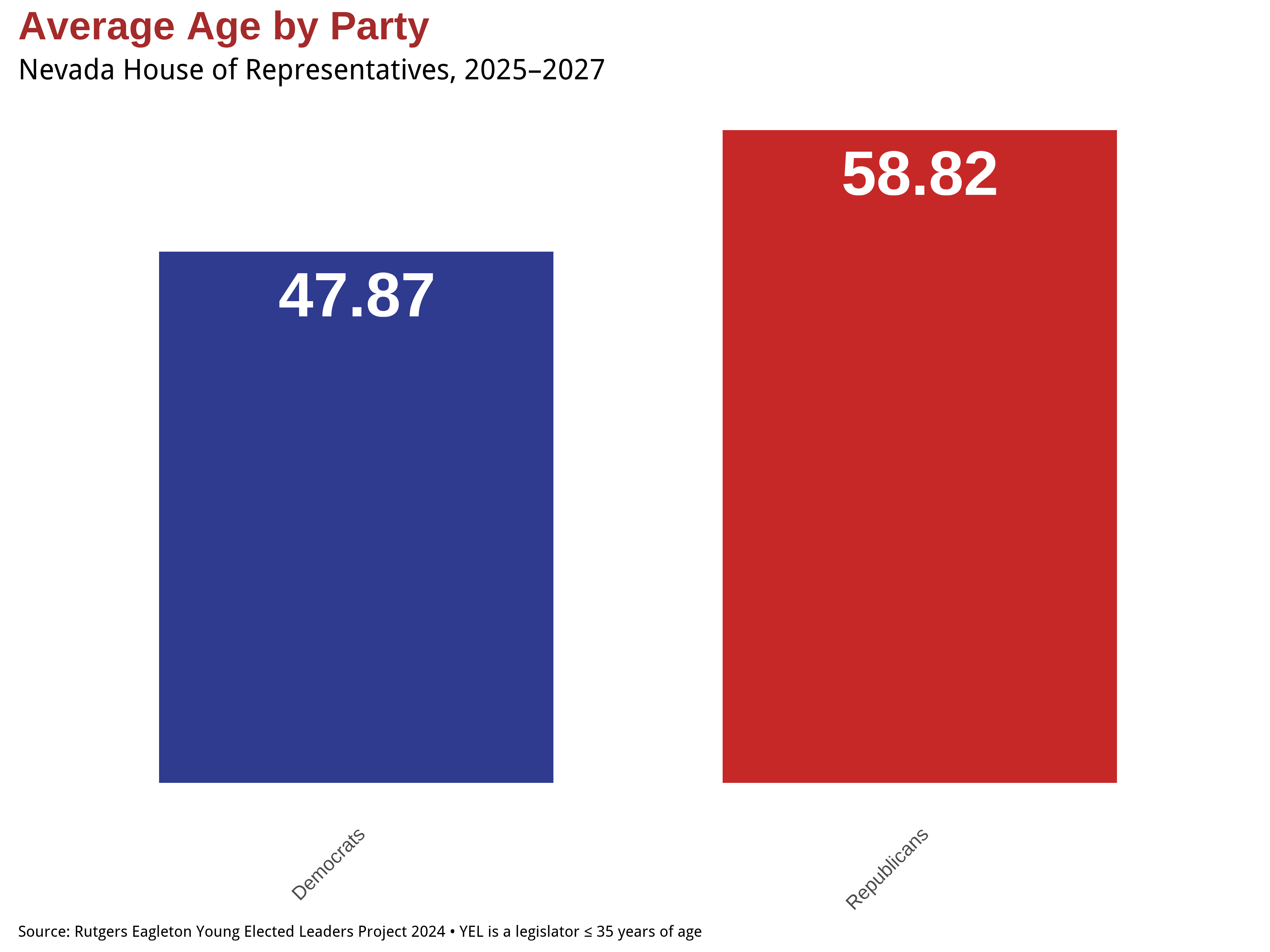 Partisan differences in the Nevada House of Representatives extend beyond ideology to include notable generational contrasts. As shown in the visual below, Republican legislators have a higher average age than their Democratic counterparts—58.82 years compared to 47.87 years—a gap of 10.95 years. These disparities may reflect broader patterns in political recruitment, generational turnover, and the types of candidates emerging in recent election cycles.