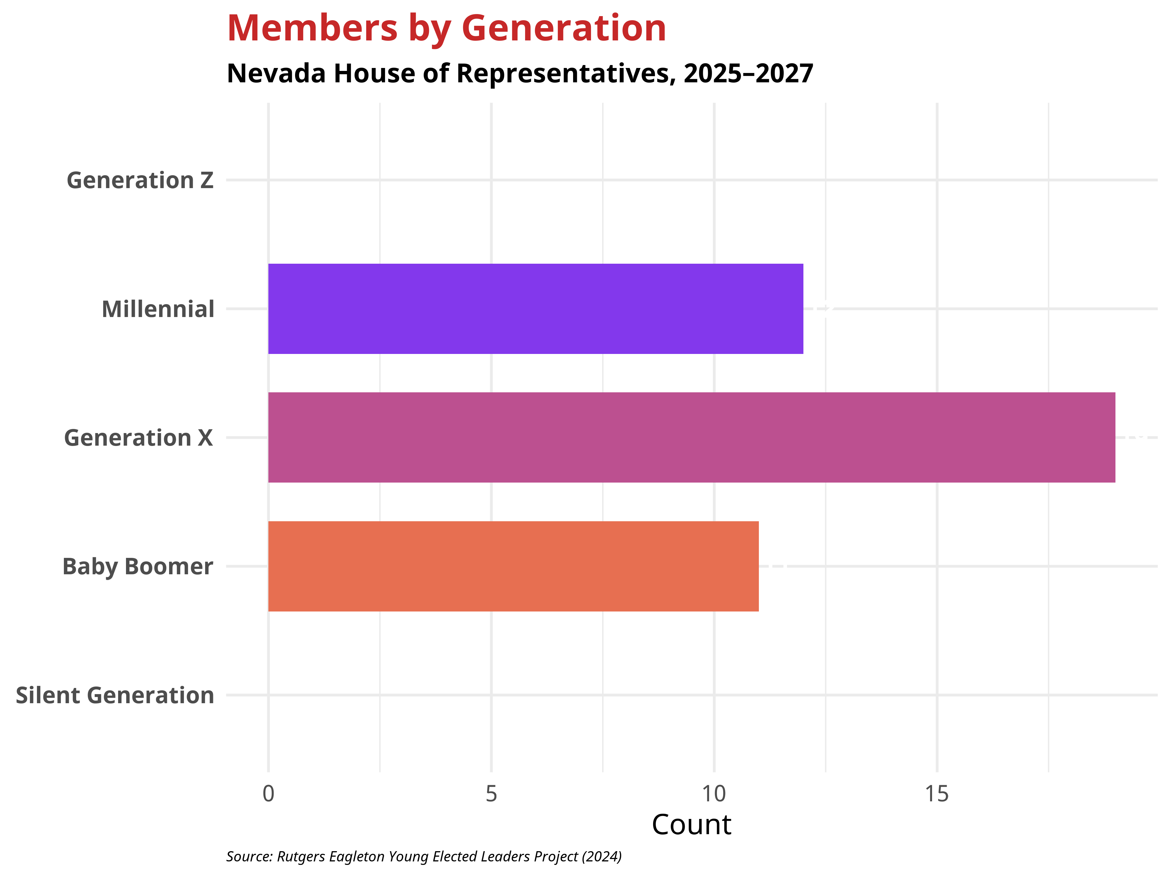 The racial and ethnic composition of the Nevada House varies across generations. In 2024, younger cohorts show more diversity, though the chamber overall remains majority White. The table below shows each generation’s distribution.