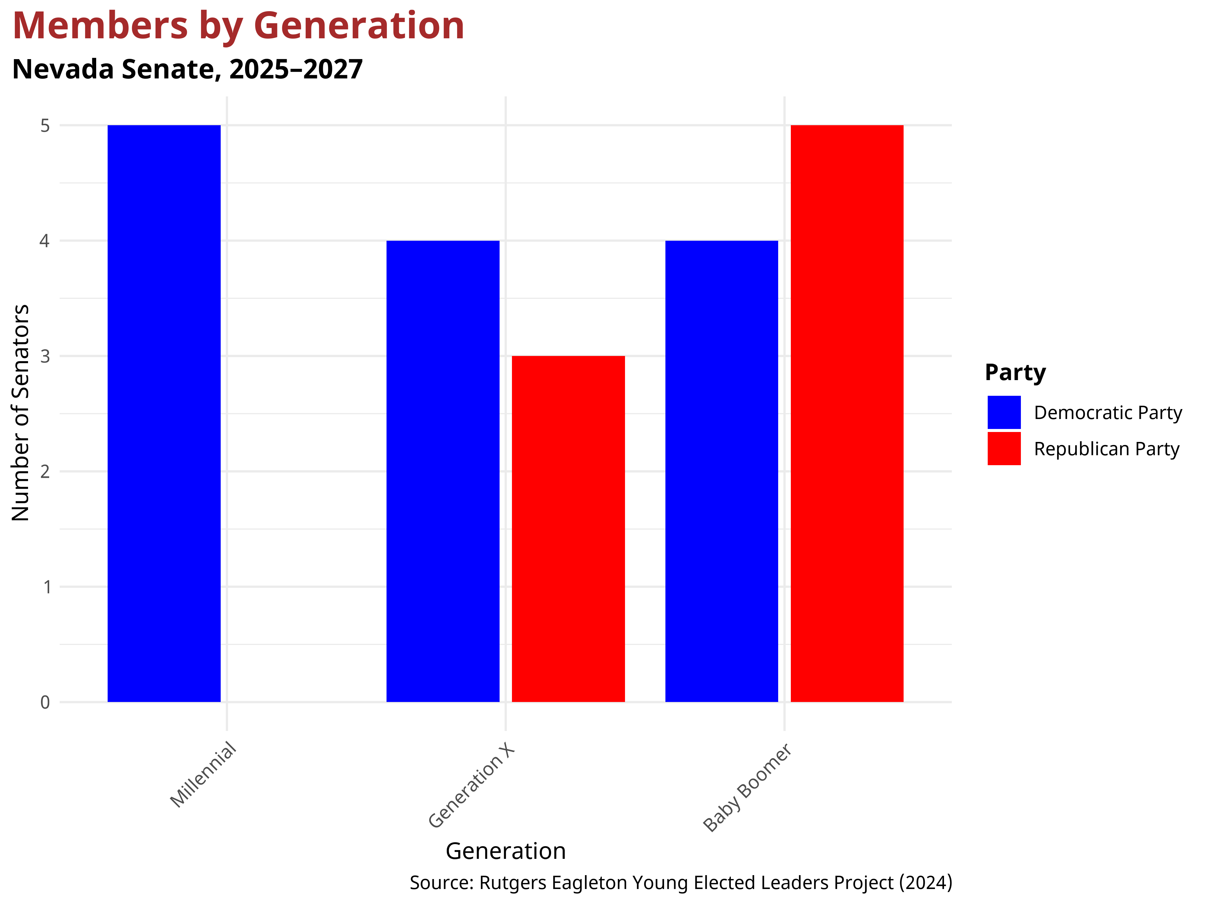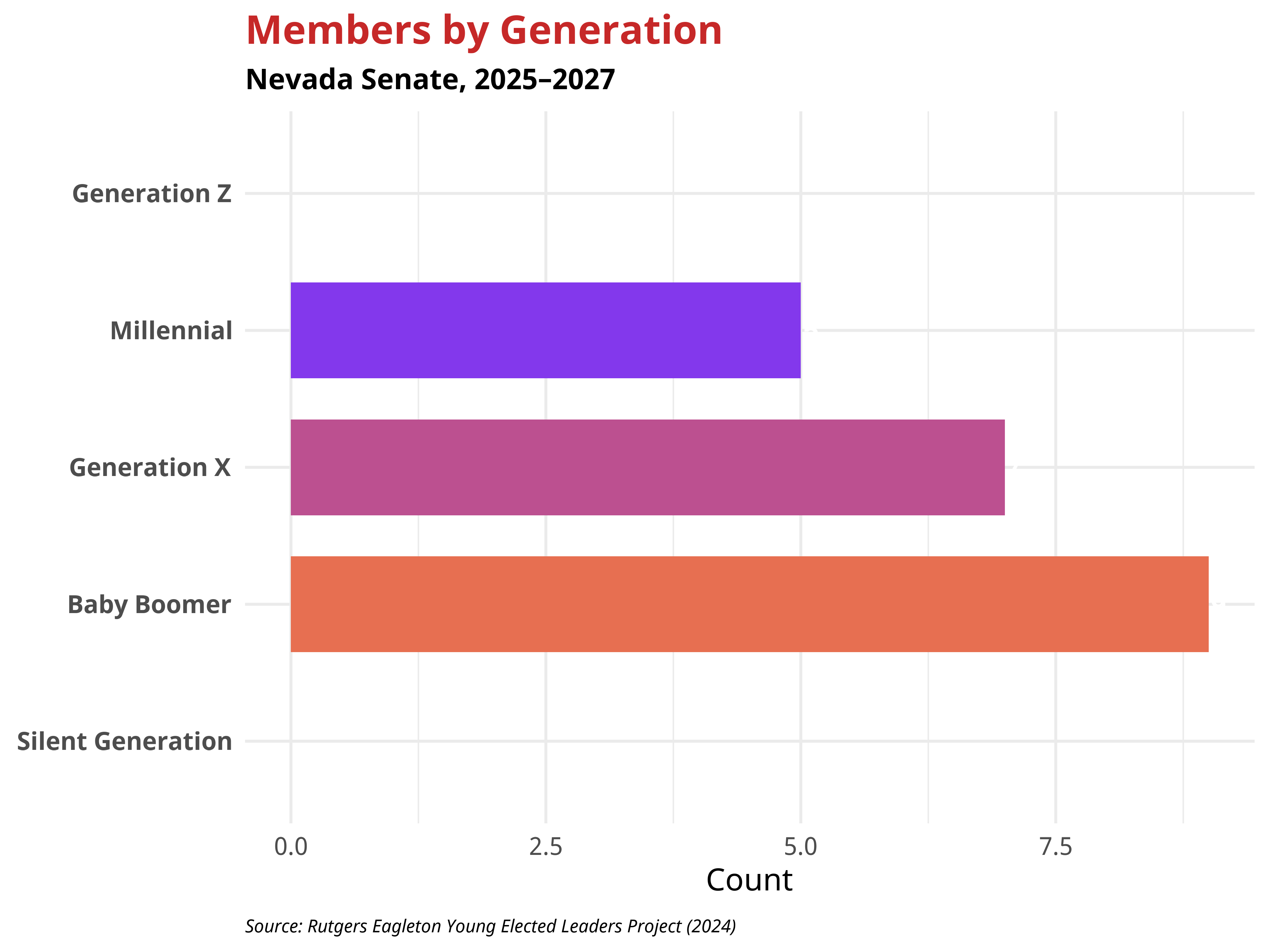 The racial and ethnic composition of the Nevada Senate shows generational variation. The table below presents the distribution by generation.