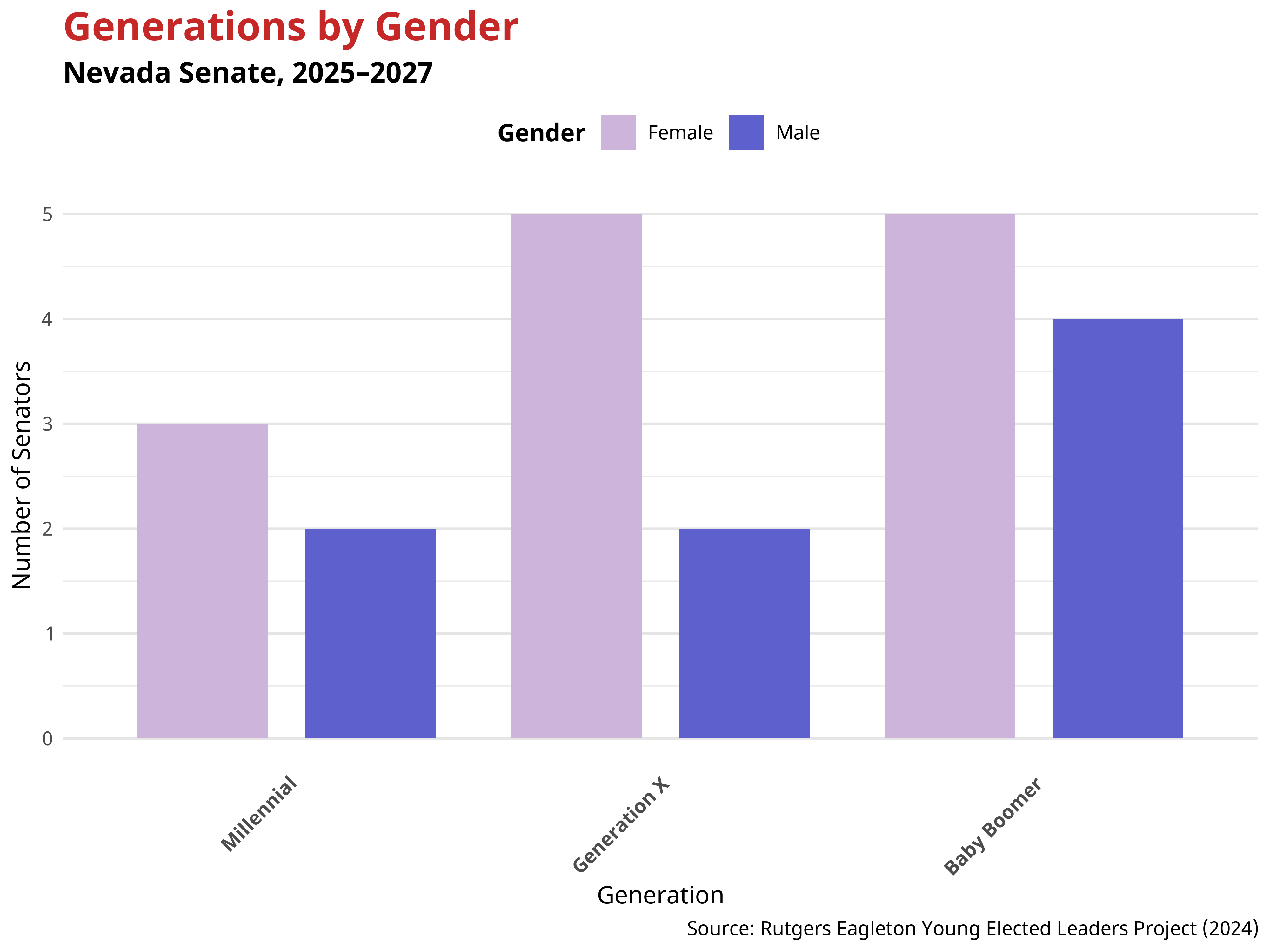 The generational makeup of the Nevada Senate reveals notable gender dynamics. Overall, women outnumber men, across Millennial, Generation X, and Baby Boomer senators. These patterns indicate that gender representation varies across generations, with women being over represented relative to other state legislatures.