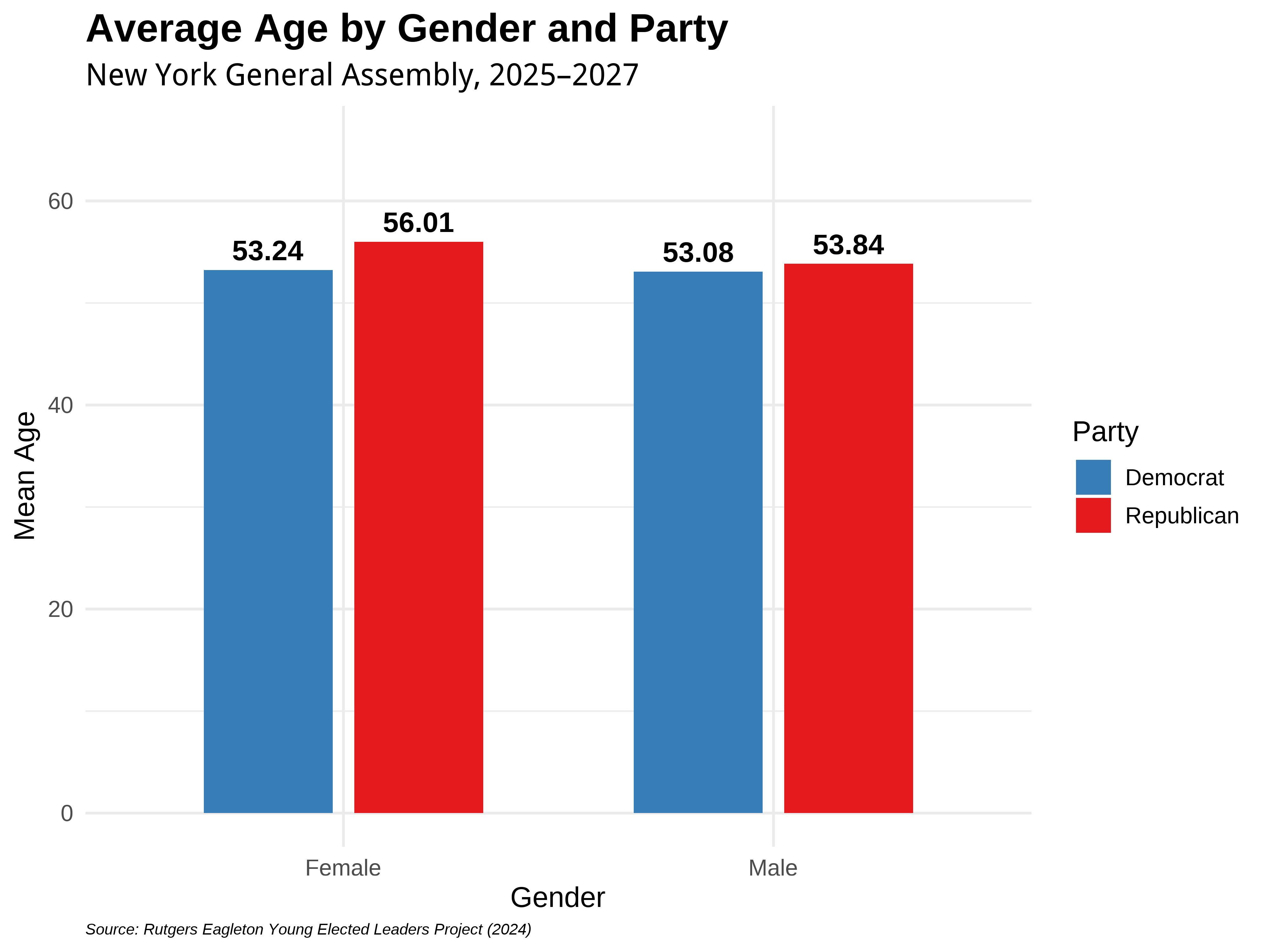 When examining both gender and party affiliation, additional differences in age emerge within the New York State Assembly. Democratic women have the highest average age of all four groups at 56.61, while Democratic men have a higher average age of 49.15. For Republicans in the New York State Assembly women averaged an age of 55.45 and Republican men featured an identical average age at 55.73. These patterns show that age representation in the New York State Assembly varies by both gender and partisan alignment, highlighting differing pathways to political office across demographic groups.