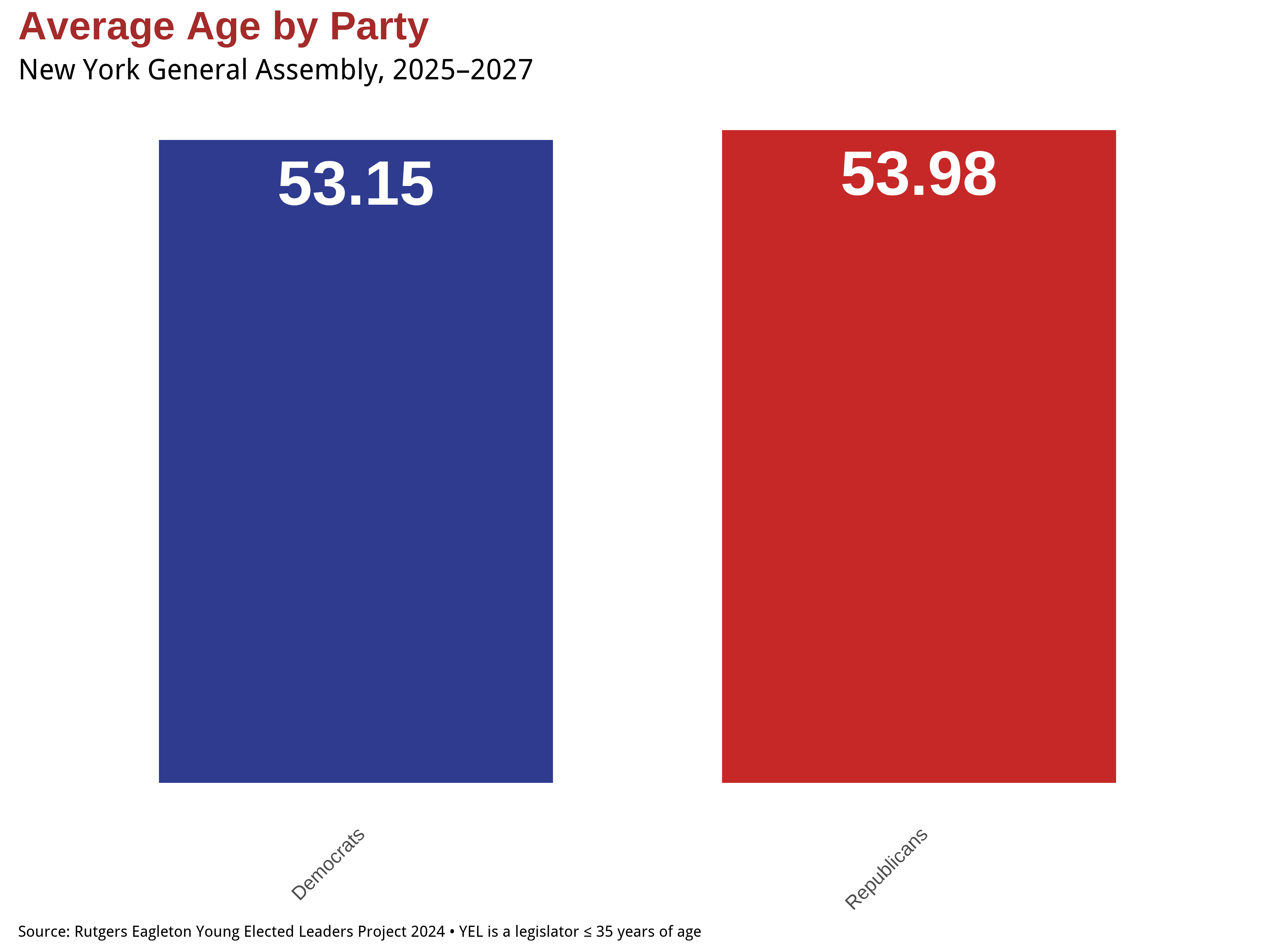 Partisan differences in the New York State Assembly extend beyond ideology to include notable generational contrasts. As shown in the visual below, Republican legislators have a slightly higher average age than their Democratic counterparts—53.98 years compared to 53.15 years—a gap of 0.83 years. These disparities may reflect broader patterns in political recruitment, generational turnover, and the types of candidates emerging in recent election cycles.