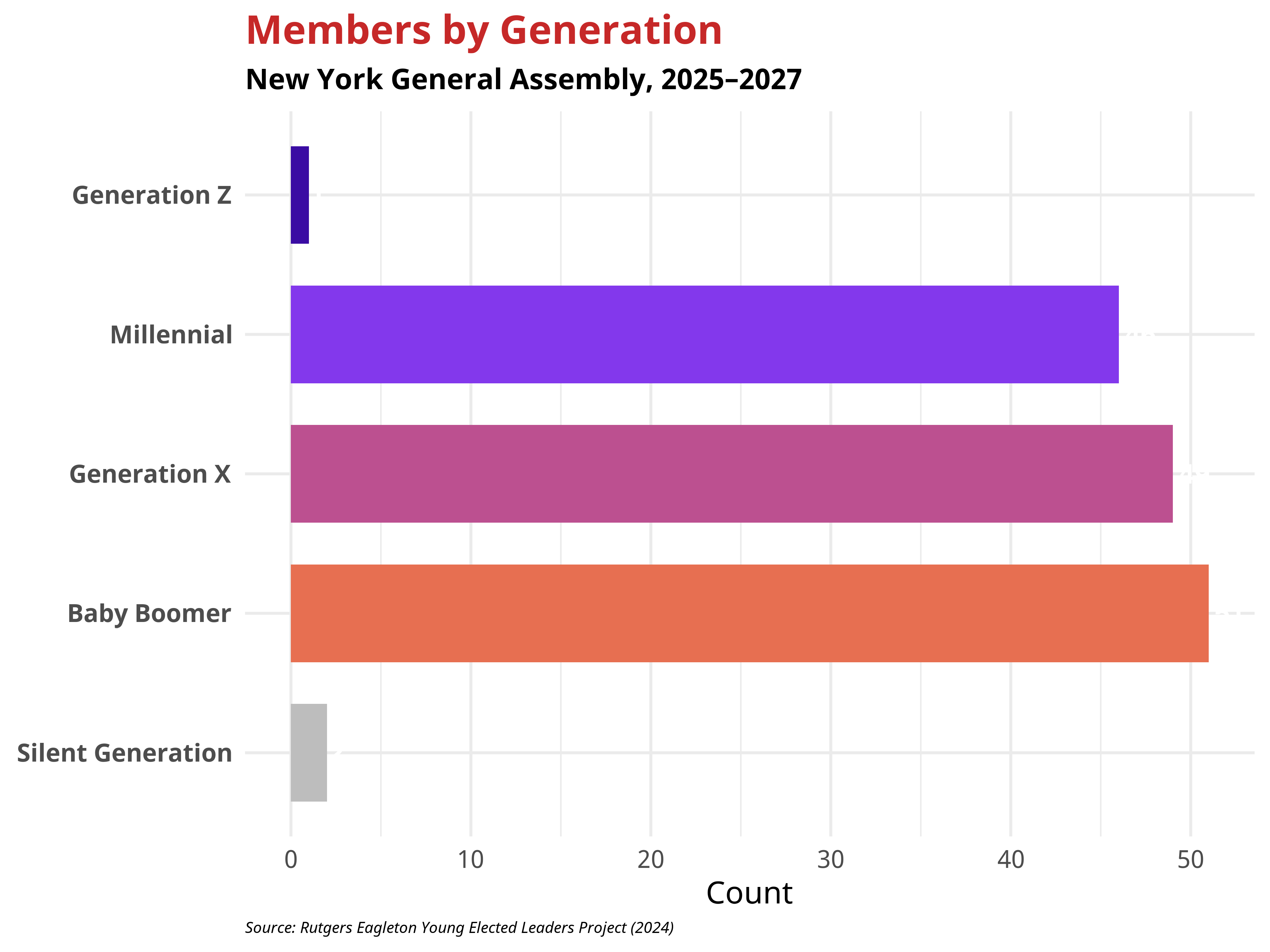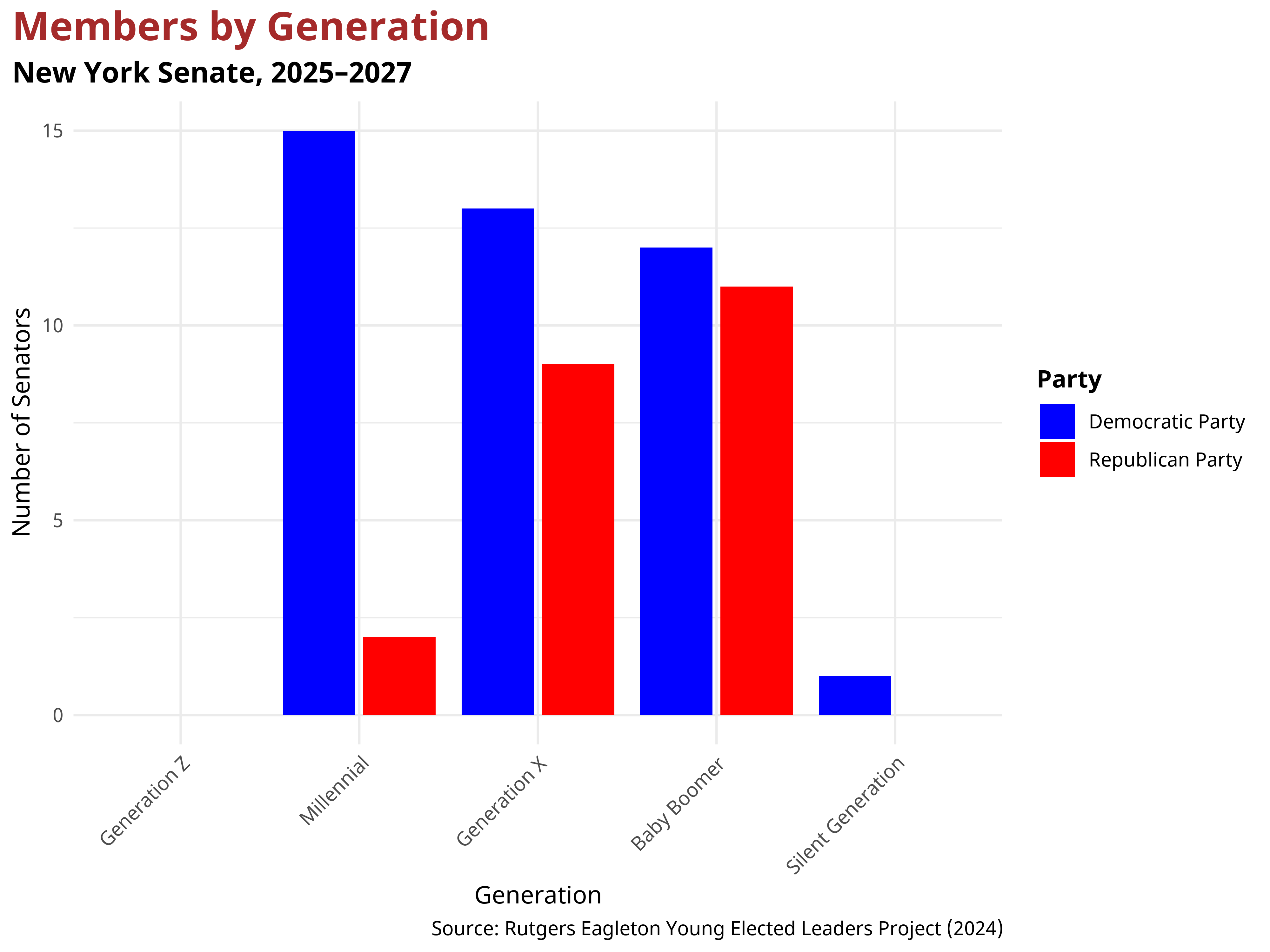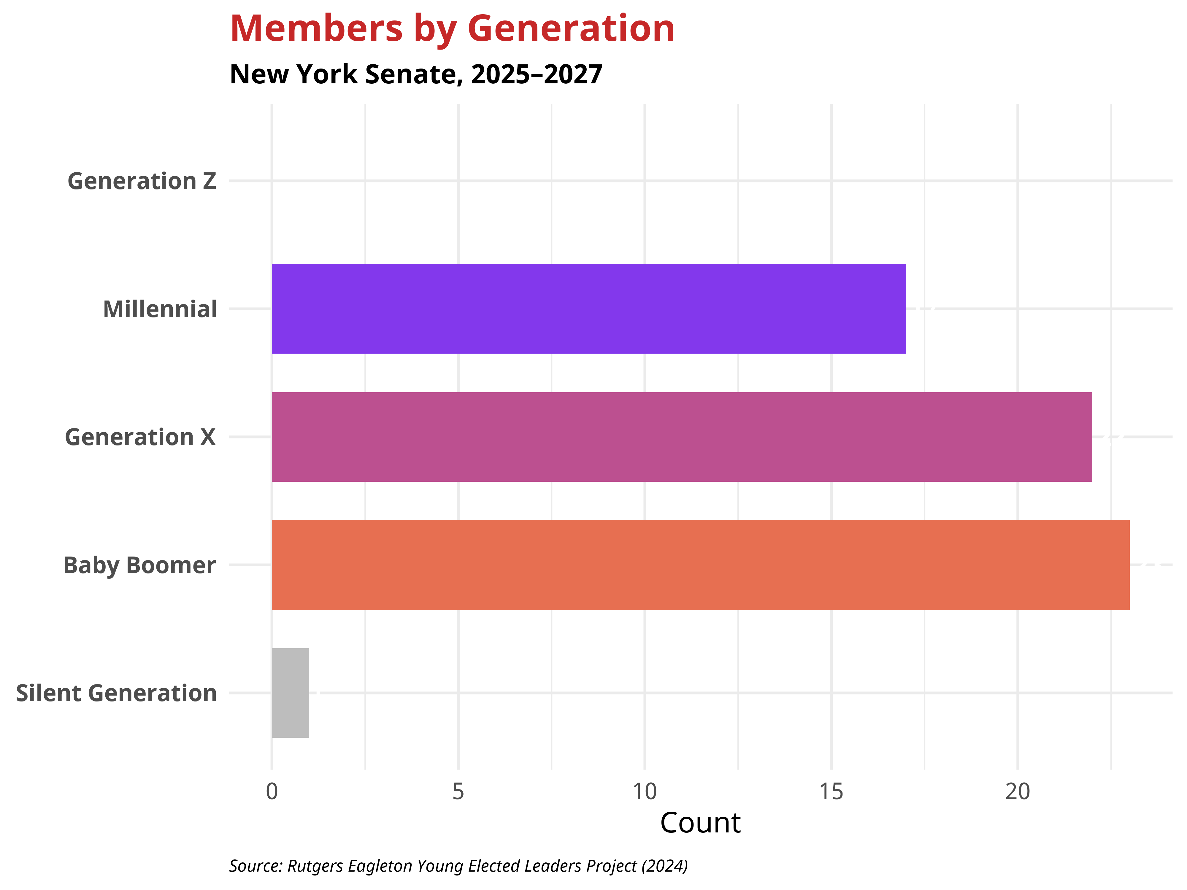 The racial and ethnic composition of the New York Senate shows generational variation. The table below presents the distribution by generation.