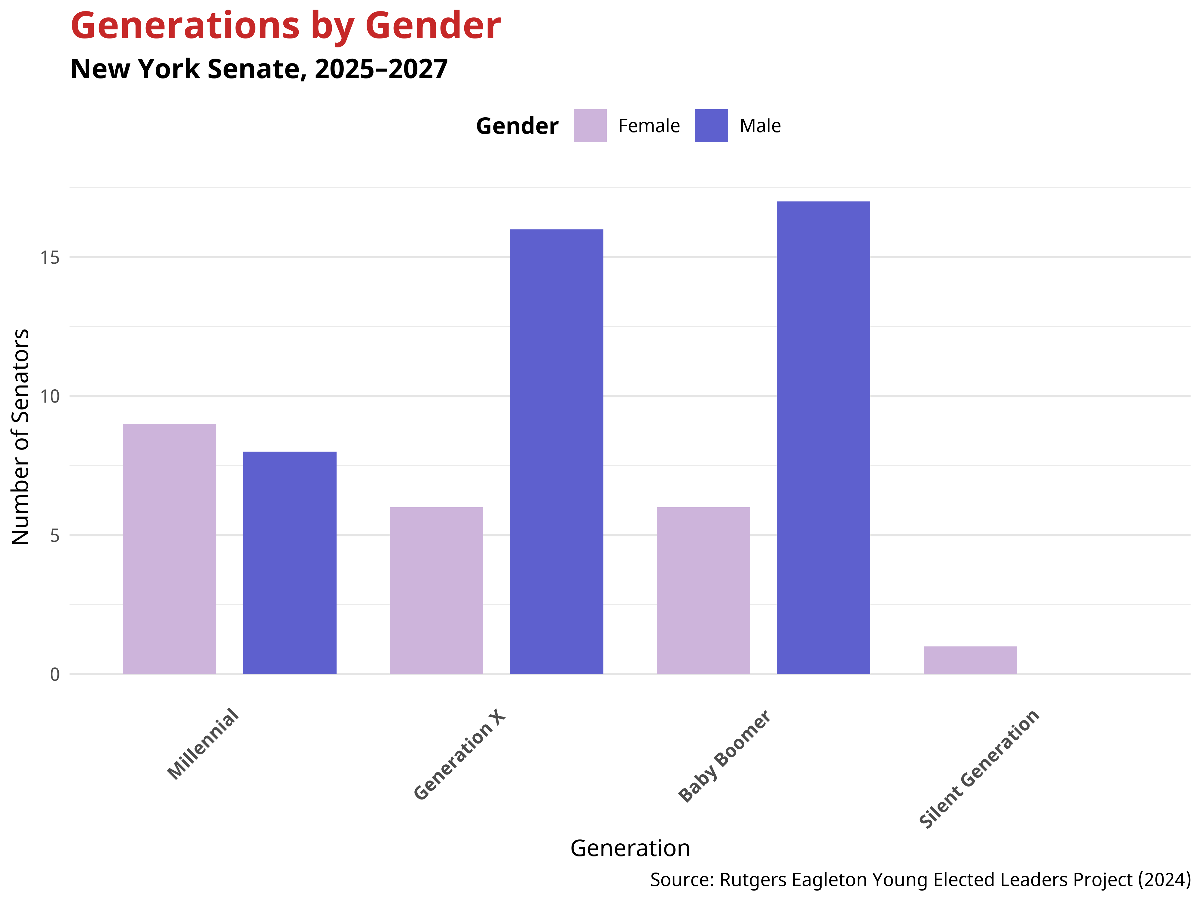 The generational makeup of the New York Senate reveals notable gender dynamics. Overall, women outnumber men,  among Millennial senators, and men have a larger presence in older generations. These patterns indicate that gender representation varies across generations, with women being represented in every generational cohort.