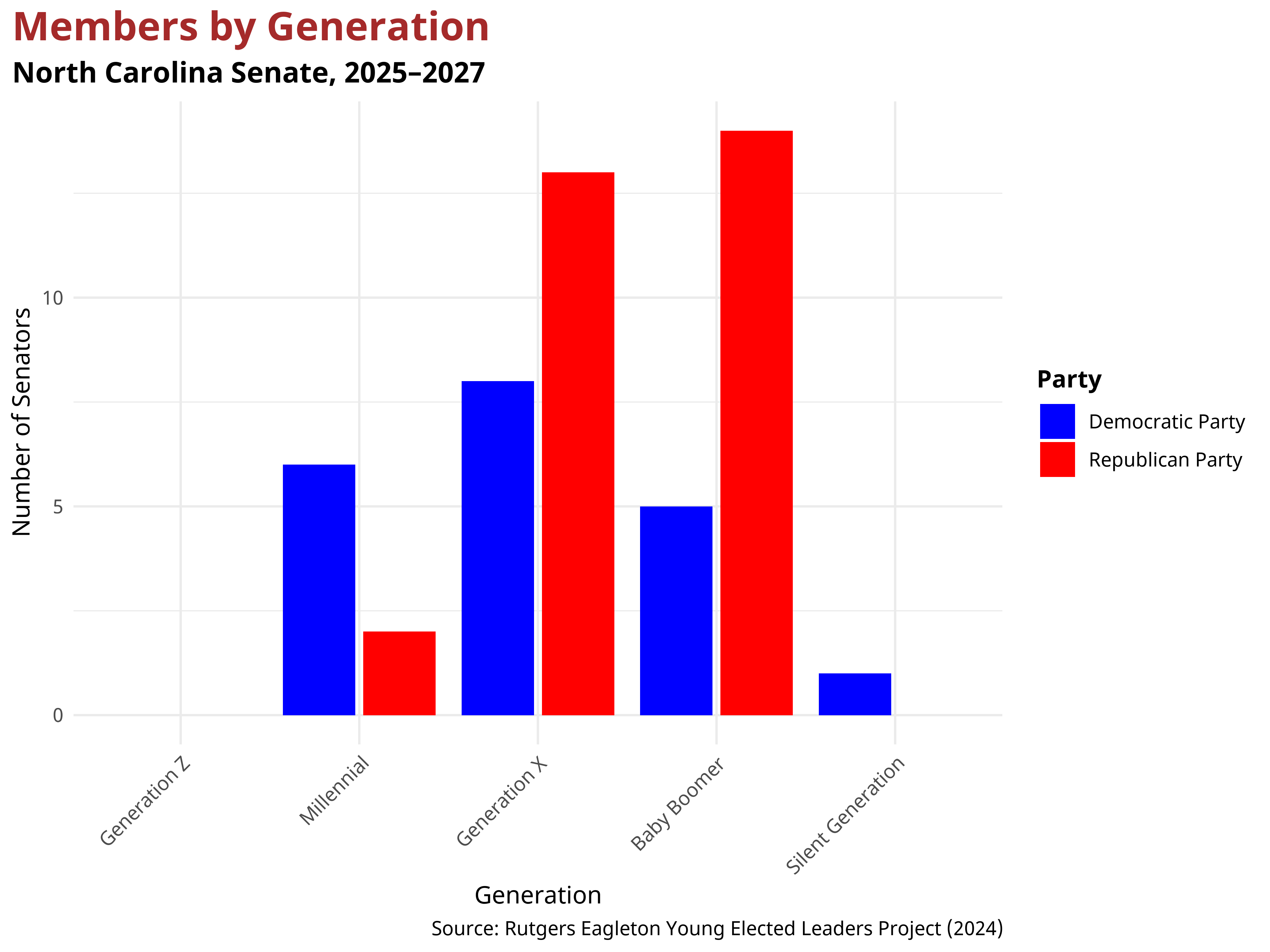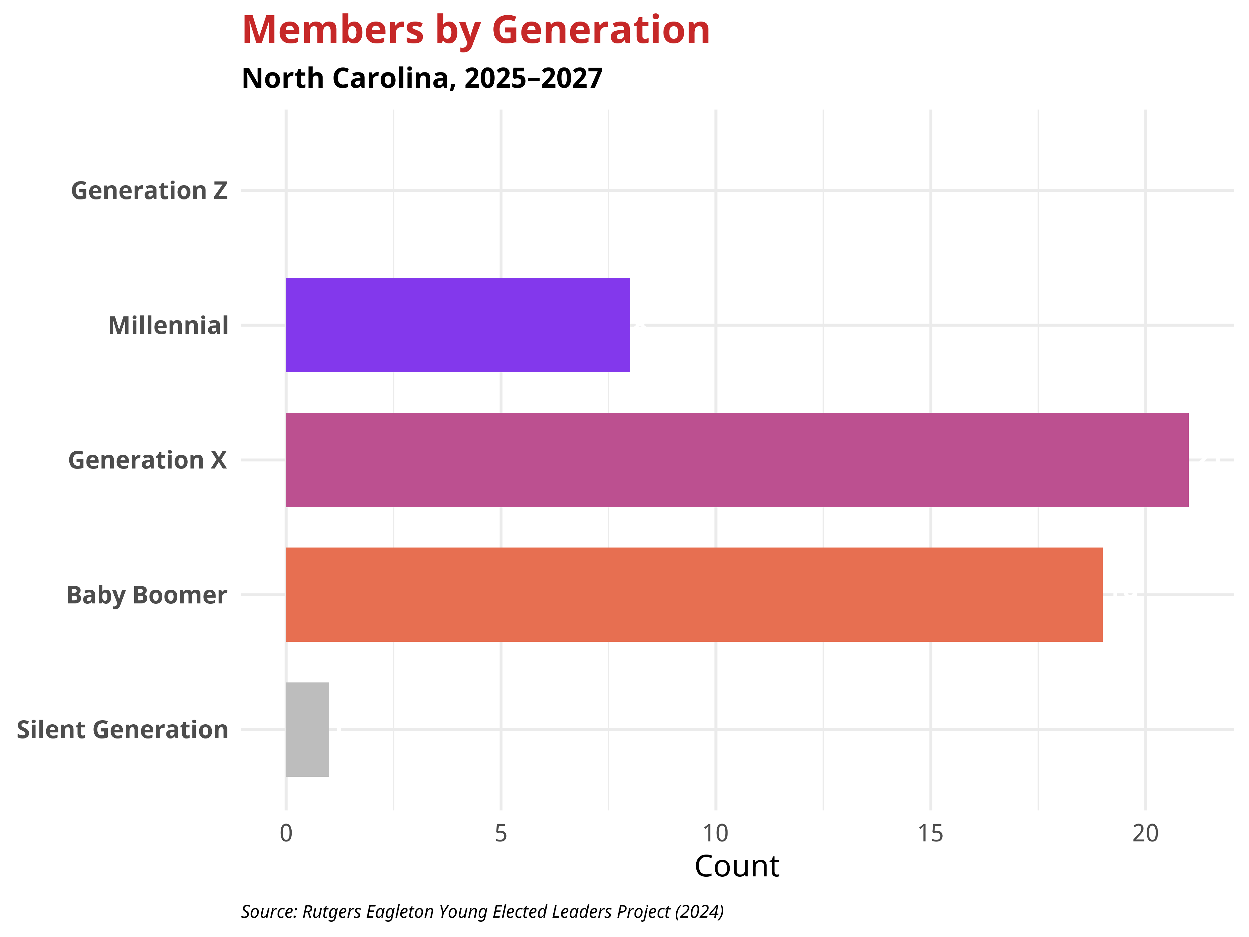 The racial and ethnic composition of the North Carolina Senate shows generational variation. The table below presents the distribution by generation.
