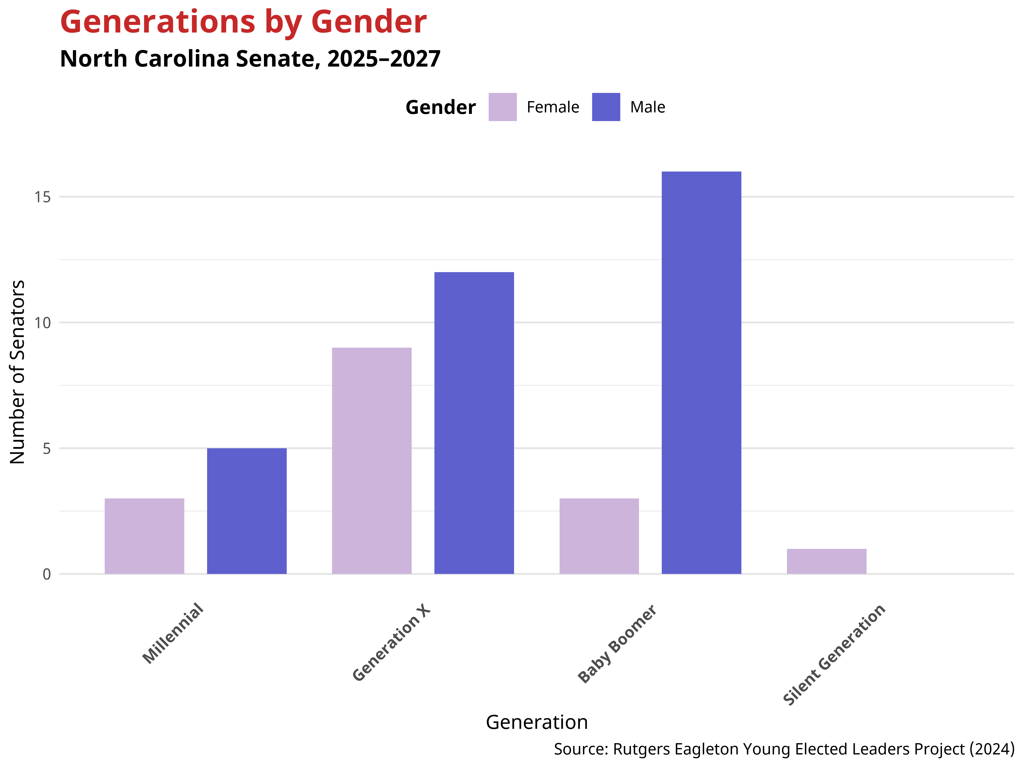 The generational makeup of the North Carolina Senate reveals notable gender dynamics. Overall, men are overrepresented across all age groups, especially among older generations. These patterns indicate that gender representation varies across generations, with women being represented in every generational cohort.