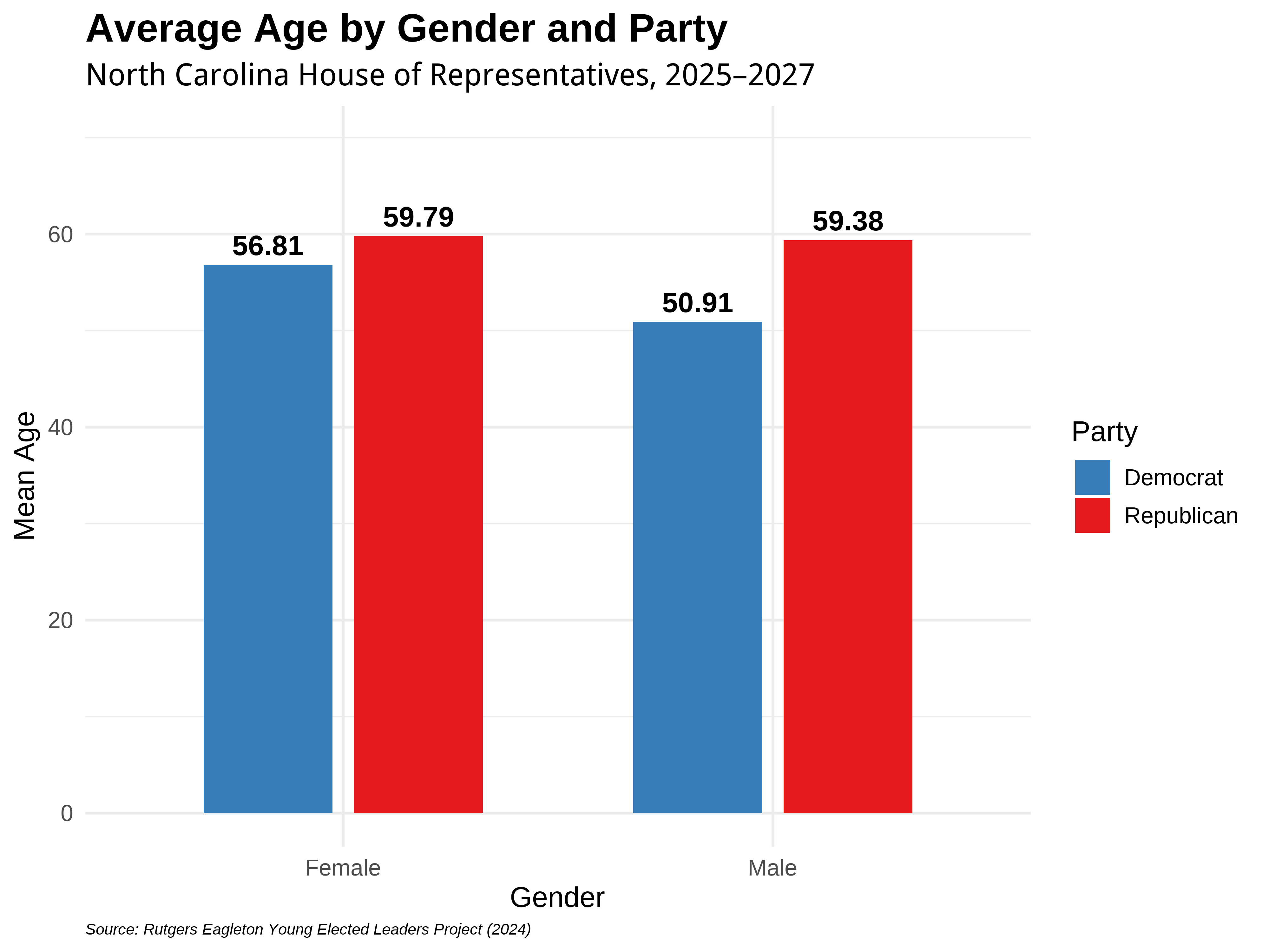 When examining both gender and party affiliation, additional age differences emerge within the North Carolina House of Representatives. Republican men and women have a higher average age when compared to Democrats.  These patterns show that age representation in the North Carolina House of Representatives varies by both gender and partisan alignment, highlighting differing pathways to political office across demographic groups.
