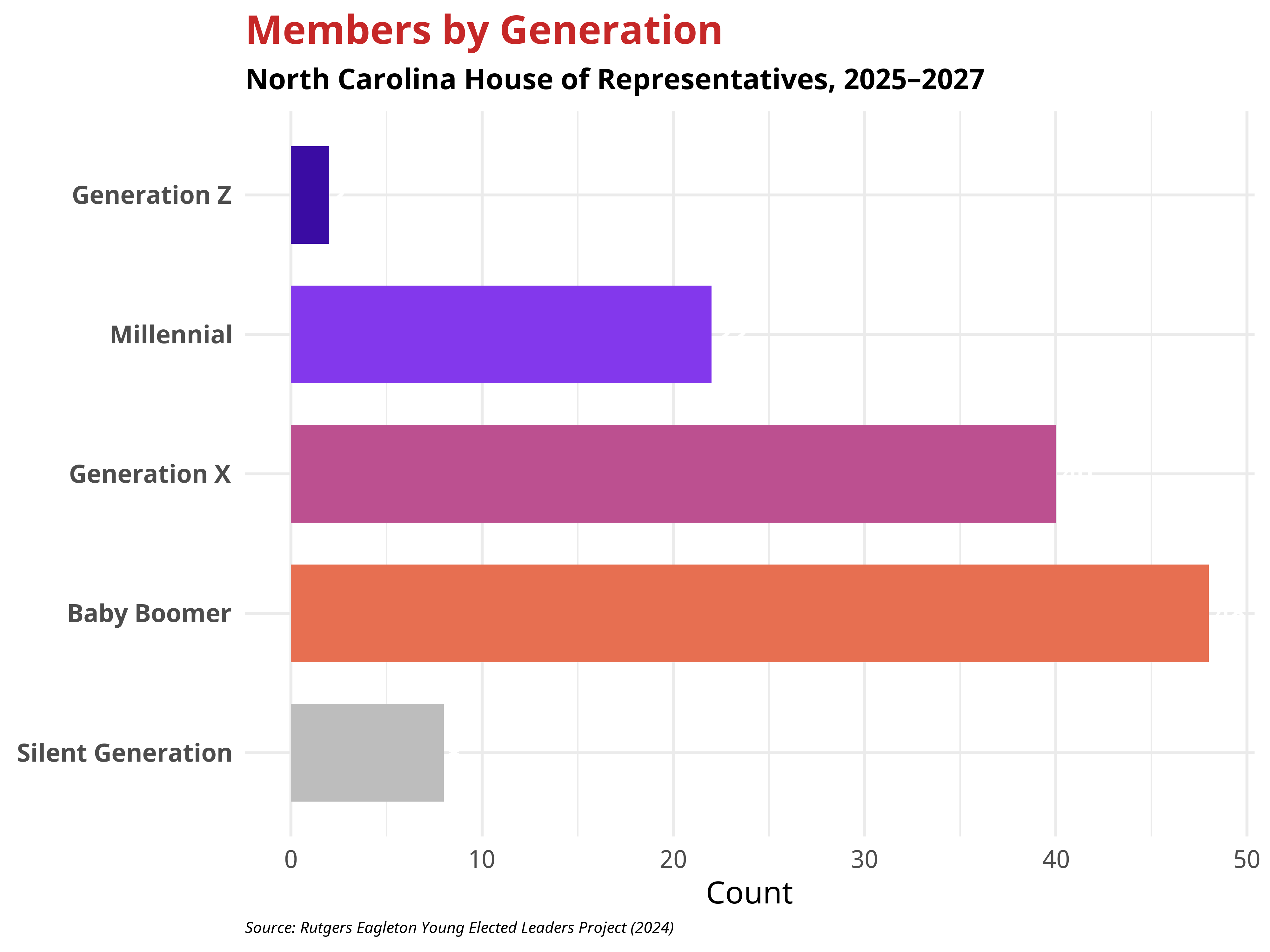 The racial and ethnic composition of the North Carolina House of Representatives varies across generations. In 2024, younger cohorts exhibit greater diversity, although the chamber as a whole remains predominantly White. The table below shows the distribution of each generation.