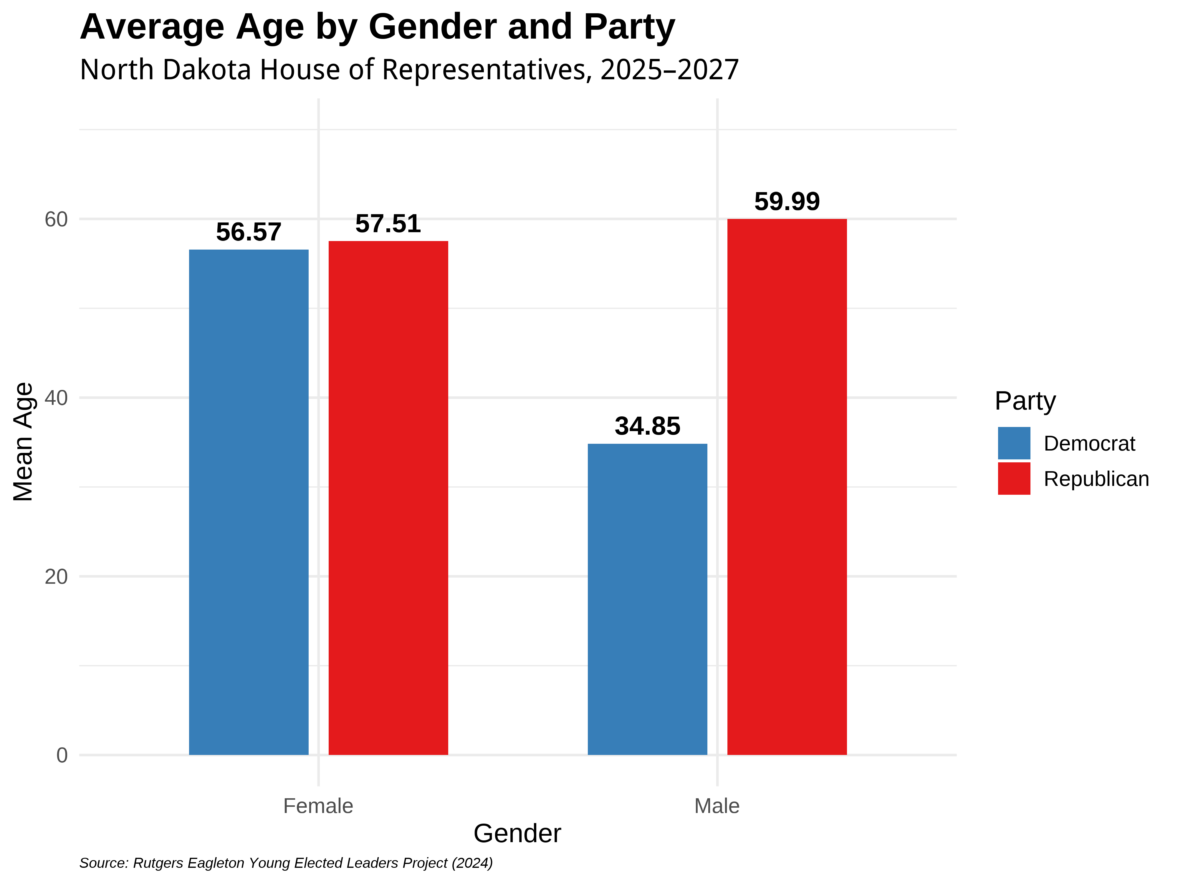 When examining both gender and party affiliation, additional age differences emerge within the North Dakota House of Representatives. Republican men and women have a higher average age when compared to Democrats. Democratic men in the North Dakota House have a disproportionately low average age, which is not surprising given the chamber’s overall low number of Democratic representatives (a total of eleven). These patterns show that age representation in the North Dakota House of Representatives varies by both gender and partisan alignment, highlighting differing pathways to political office across demographic groups.