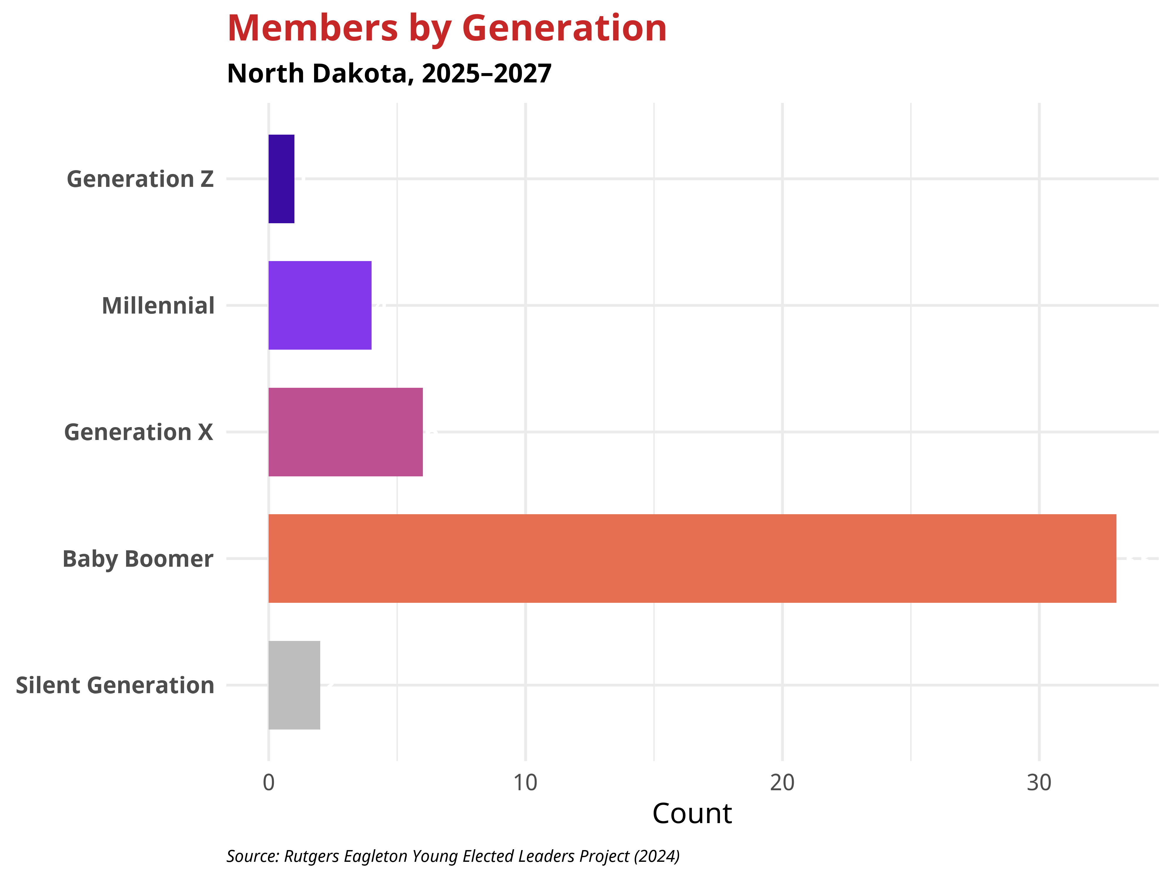 The racial and ethnic composition of the North Dakota Senate shows generational variation. The table below presents the distribution by generation.