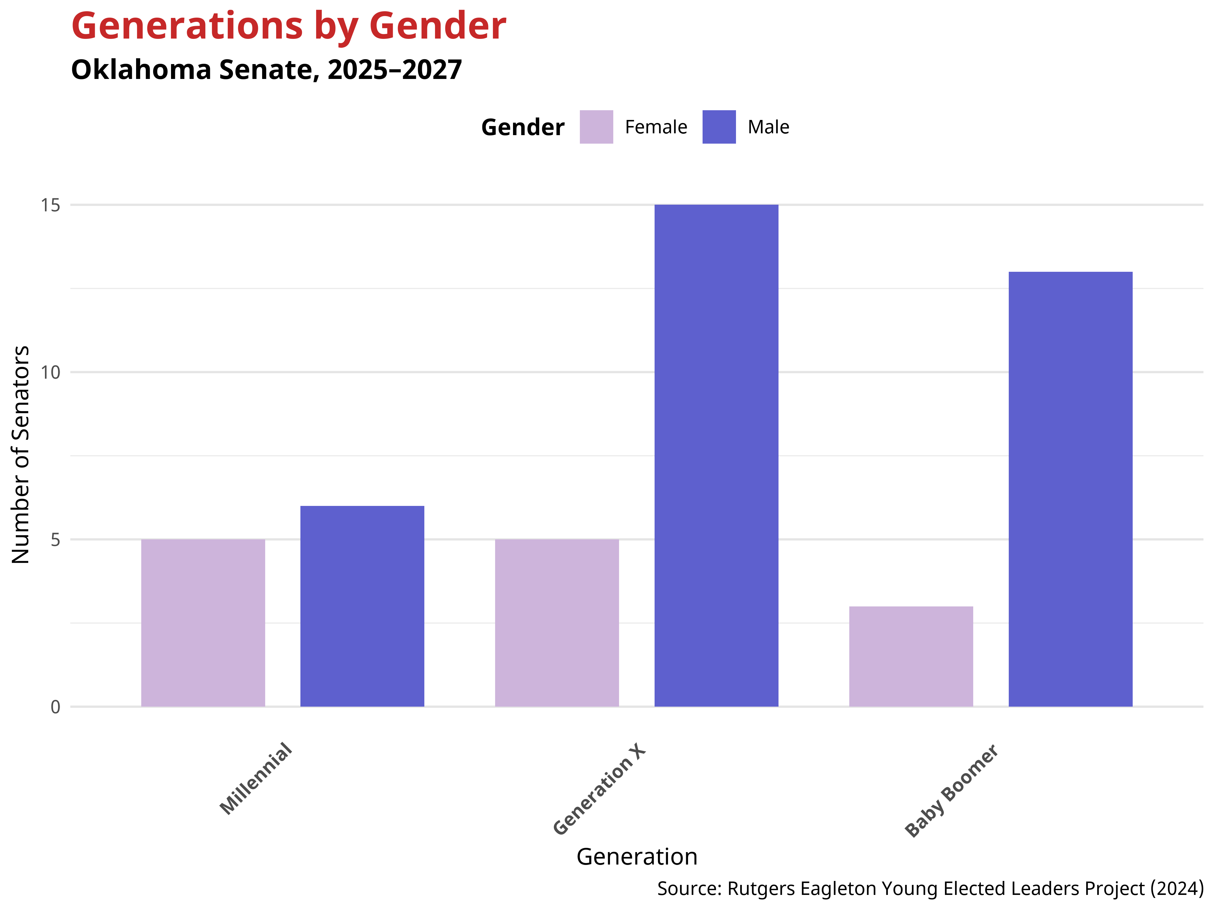 The generational makeup of the Oklahoma Senate reveals notable gender dynamics. Overall, men are overrepresented across all age groups, especially among older generations. These patterns indicate that gender representation varies across generations, with women being represented in every generational cohort.