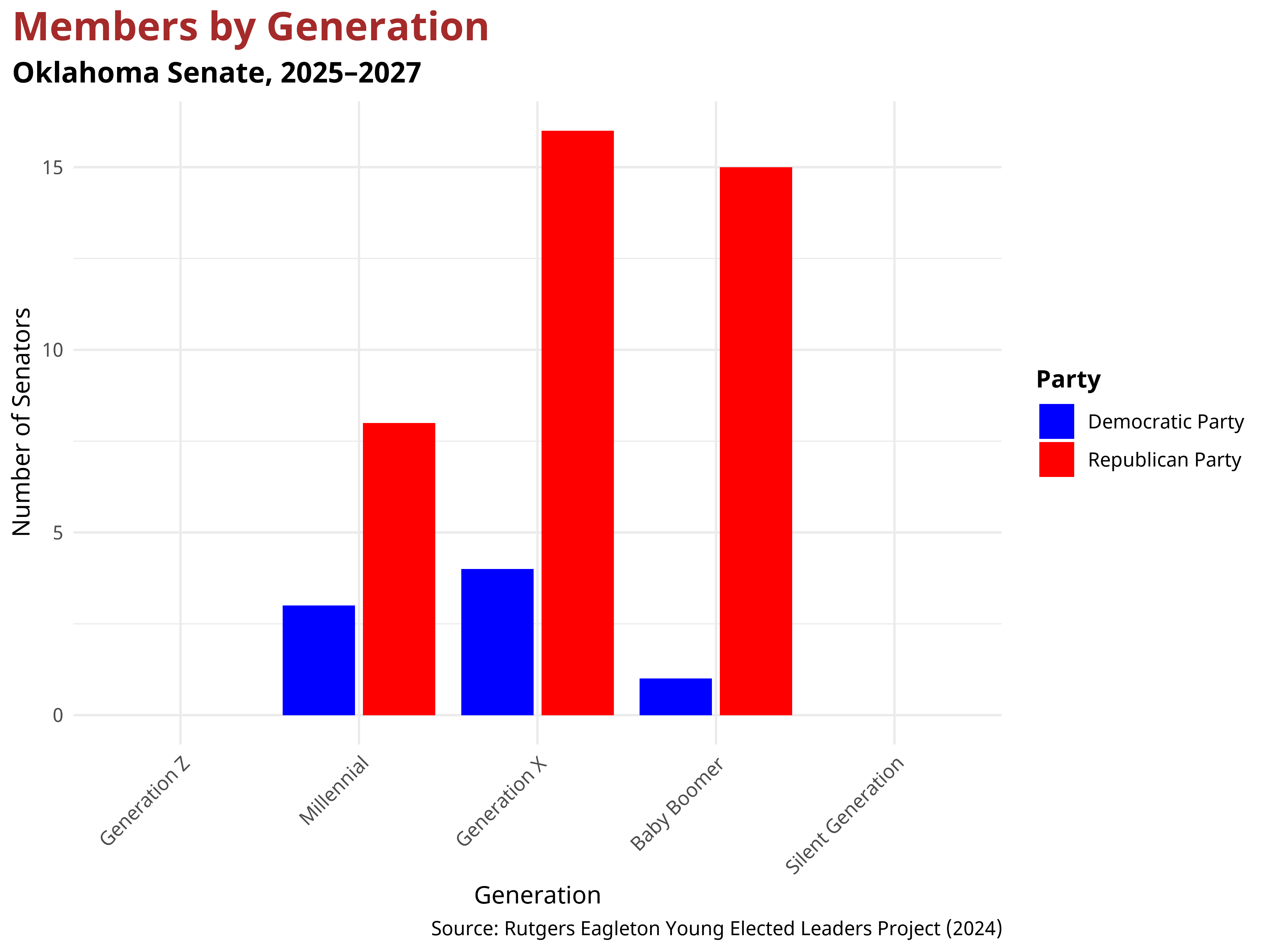 In the Oklahoma State Senate, 39 senators belong to the Republican Party, and 8 senators are Democrats. The mean age of Republican state senators after the 2024 election was 55.22, while the mean age of Democratic state senators was 50.12. Each generation had a different partisan makeup; overall, the Oklahoma Senate is overwhelmingly comprised of Baby Boomer and Gen X Republicans. Below is the breakdown of party composition for each generation within the Oklahoma State Senate.