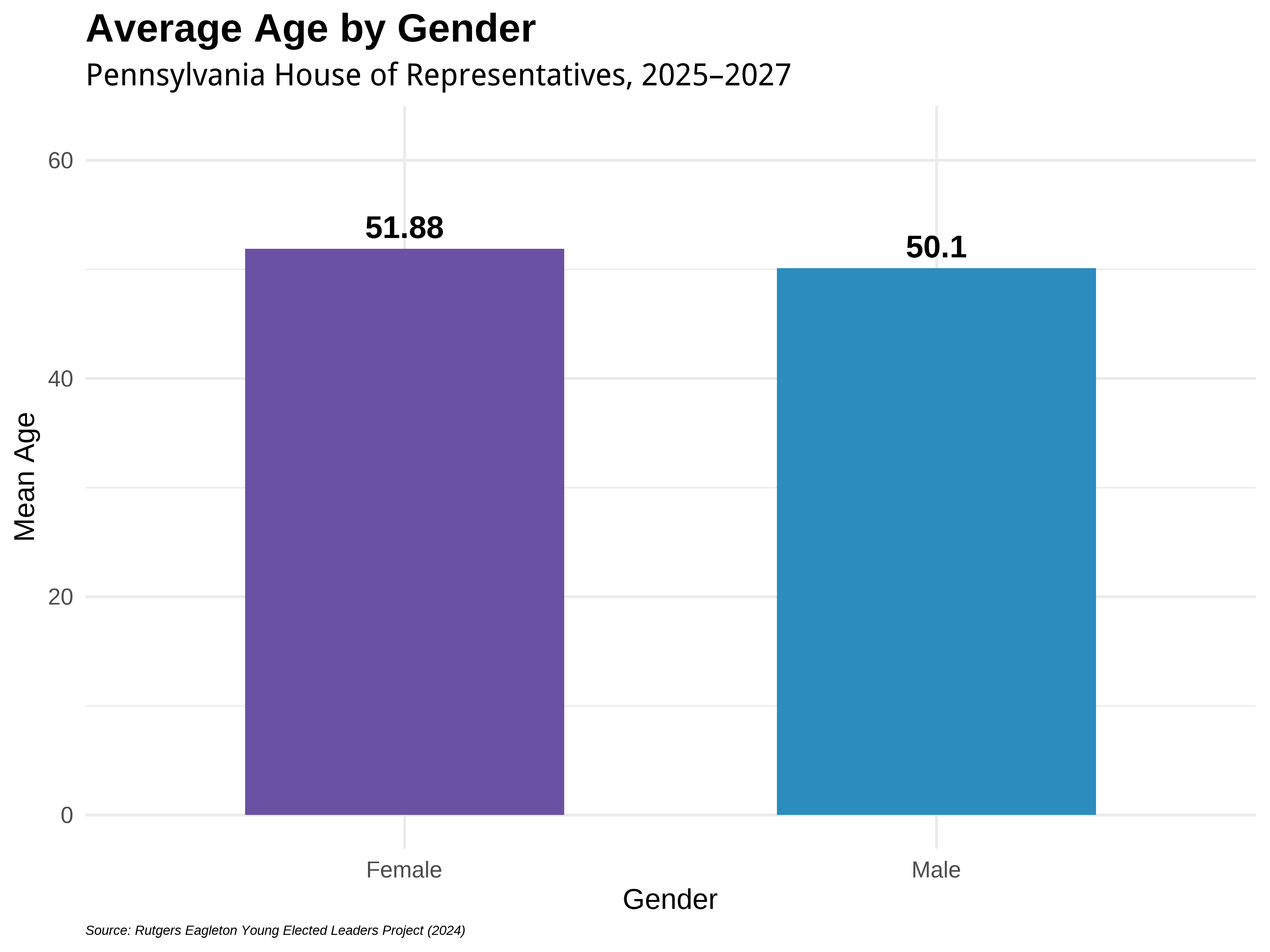 Partisan differences in the Pennsylvania House extend beyond ideology to include notable generational contrasts. As shown in the visual below, Republican legislators have a higher average age than their Democratic counterparts—51.54 years compared to 49.75 years—a gap of 1.79 years. These disparities may reflect broader patterns in political recruitment, generational turnover, and the types of candidates emerging in recent election cycles. However, PAs’ disparity between average ages by party is noticeably smaller than others.