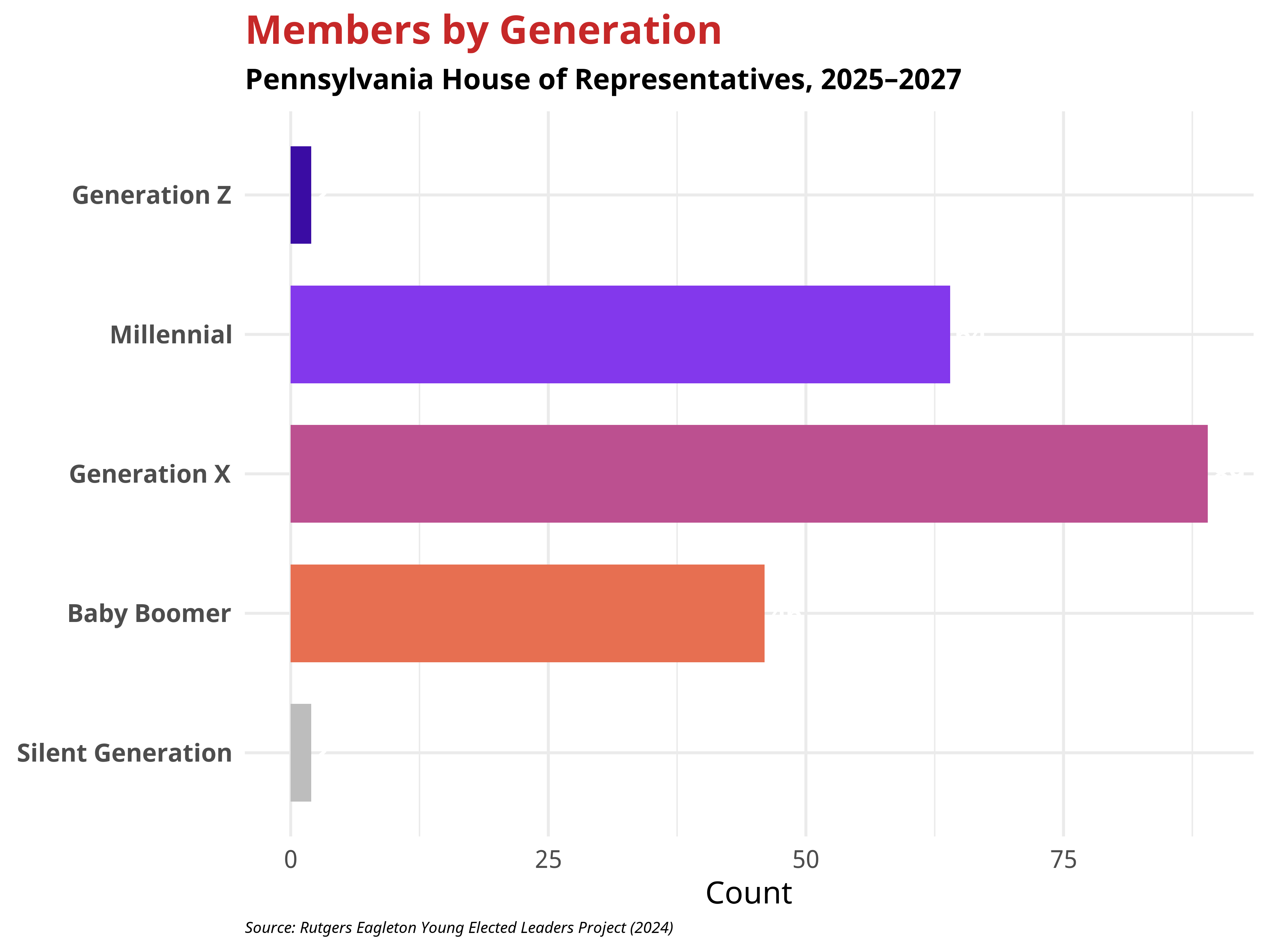 Within the Pennsylvania House of Representatives, most representatives come from the Millennial, Generation X, or the Baby Boomer generations. Scroll below to view the generations represented in the Pennsylvania House of Representatives.