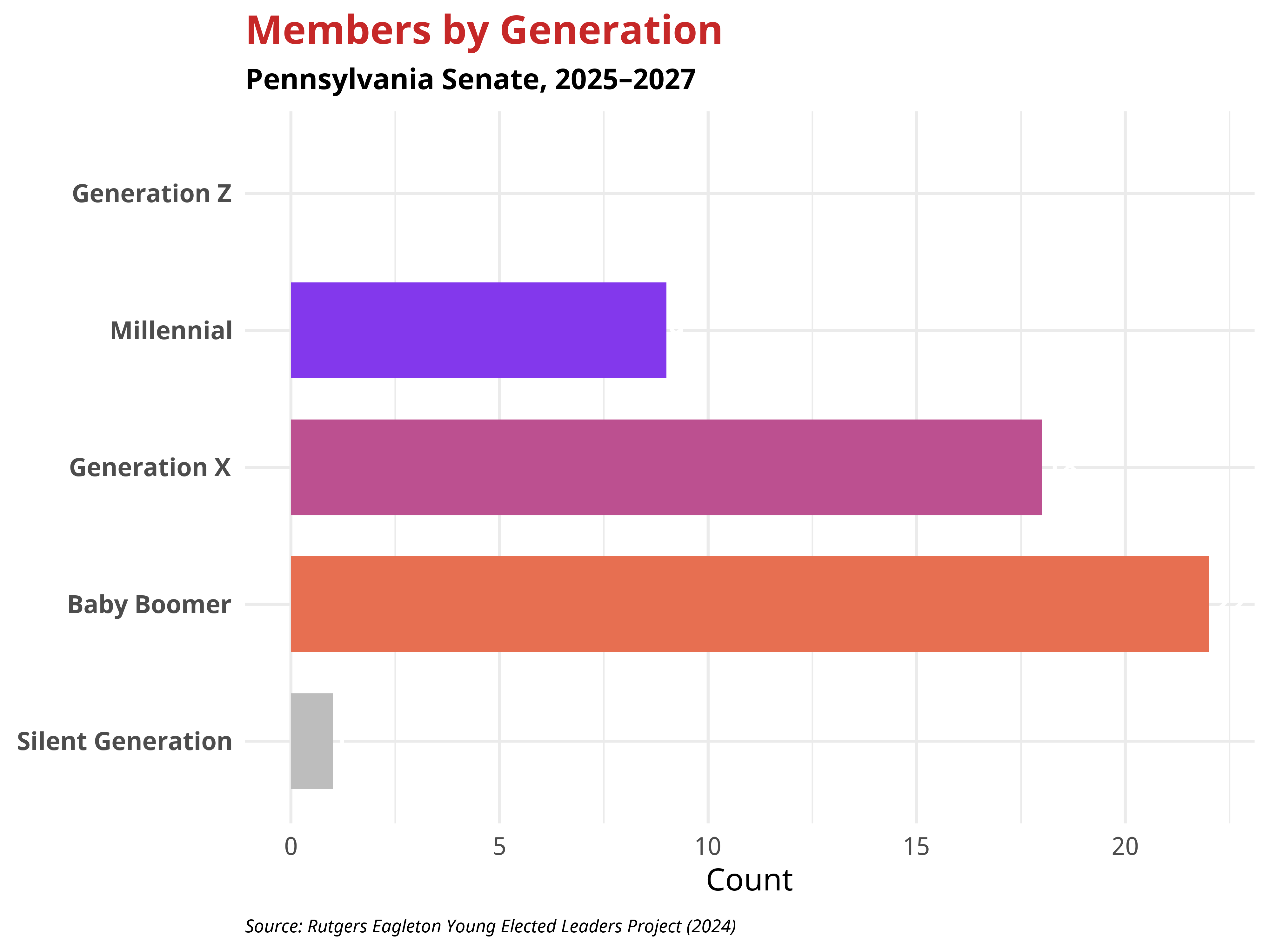 The racial and ethnic composition of the Pennsylvania Senate shows generational variation. The table below presents the distribution by generation.