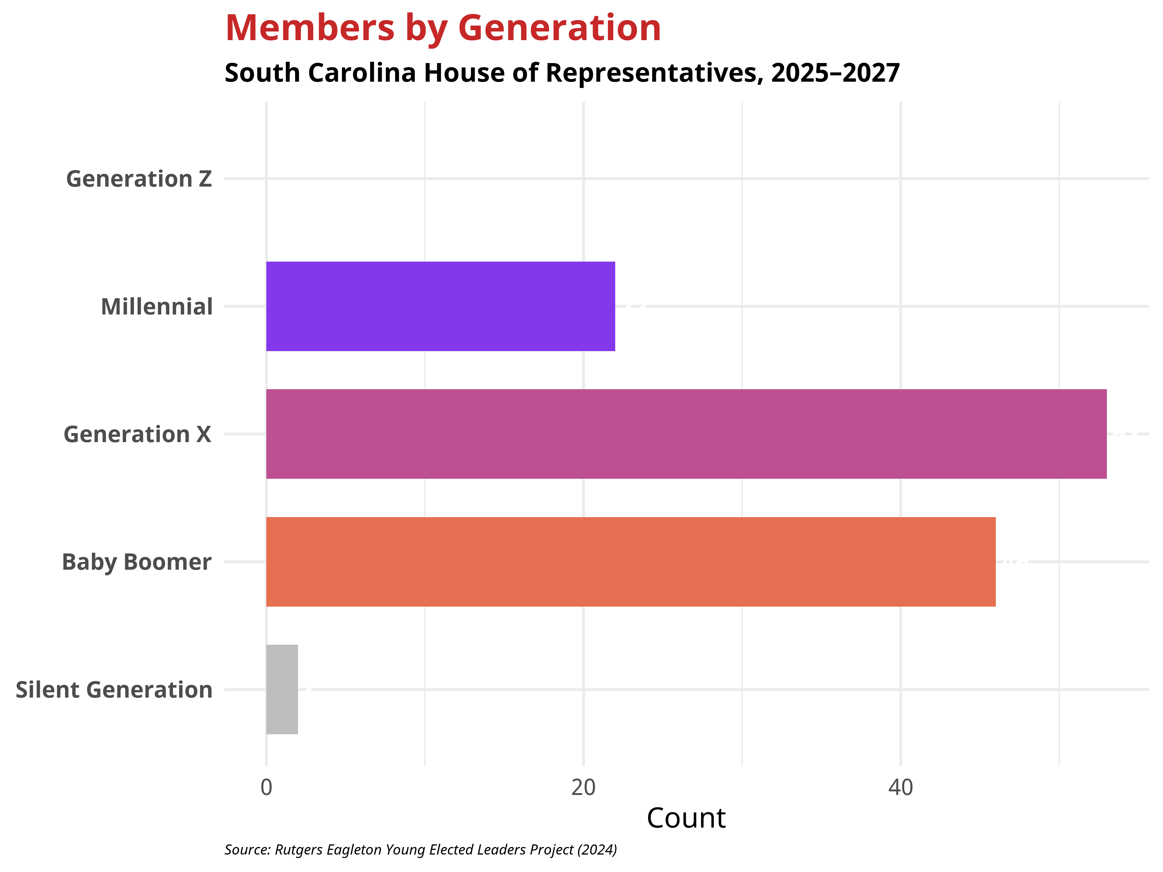 The racial and ethnic composition of the South Carolina House of Representatives varies across generations. In 2024, younger cohorts exhibit greater diversity, although the chamber as a whole remains predominantly White. The table below shows the distribution of each generation.