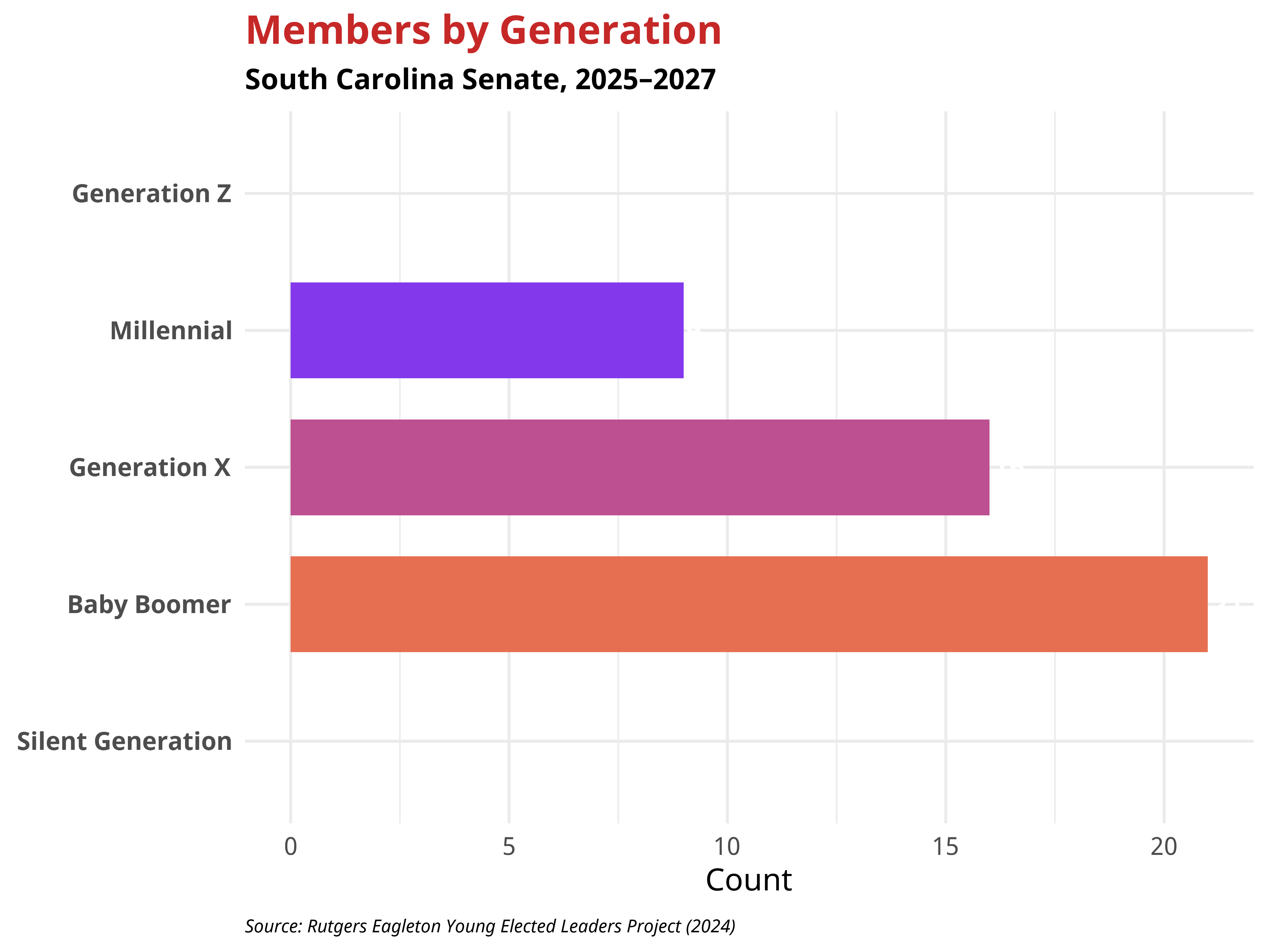 The racial and ethnic composition of the South Carolina Senate shows generational variation. The table below presents the distribution by generation.