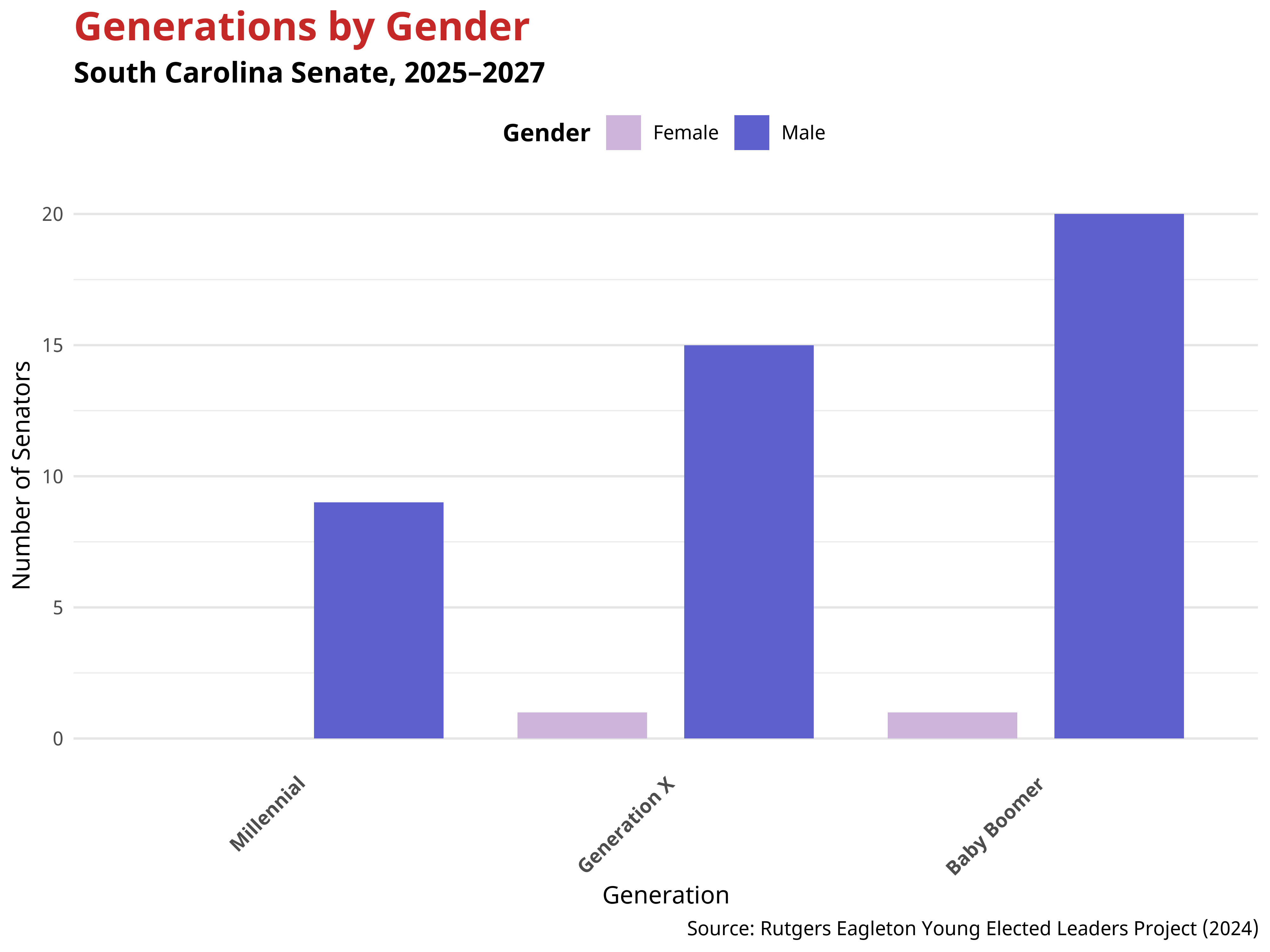 The generational makeup of the South Carolina Senate reveals notable gender dynamics. Overall, men are overrepresented across all age groups, especially among older generations. These patterns indicate that gender representation varies across generations, with women being represented in every generational cohort.
