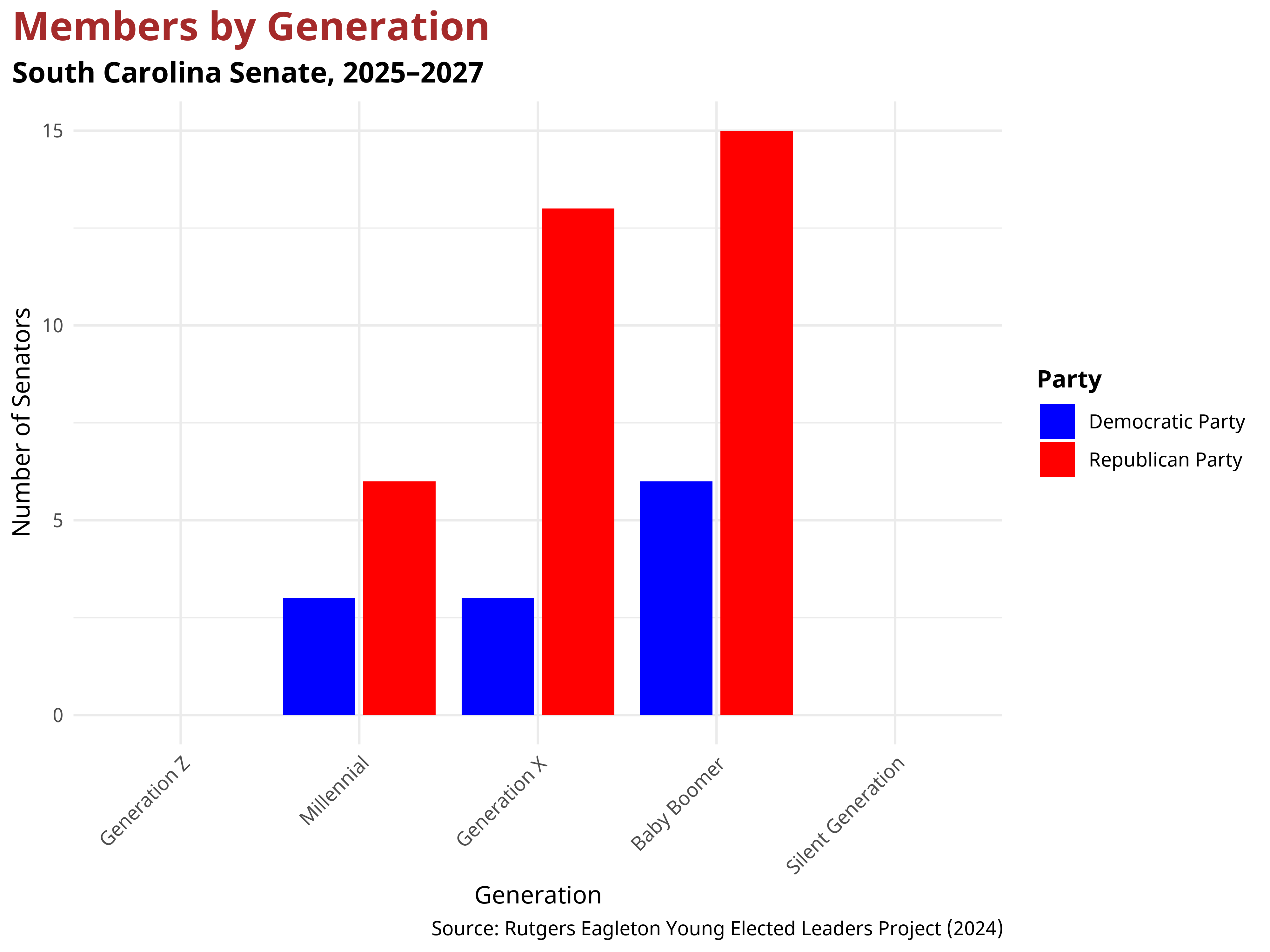 In the South Carolina State Senate, 34 senators belong to the Republican Party, and 12 senators are Democrats. The mean age of Democratic state senators after the 2024 election was 54.3, while the mean age of Republican state senators was 56.36. Each generation has a different partisan makeup; overall, the South Carolina State Senate is overwhelmingly composed of Baby Boomers, Generation X, and Millennials. Below is the breakdown of party composition by generation in the South Carolina State Senate.