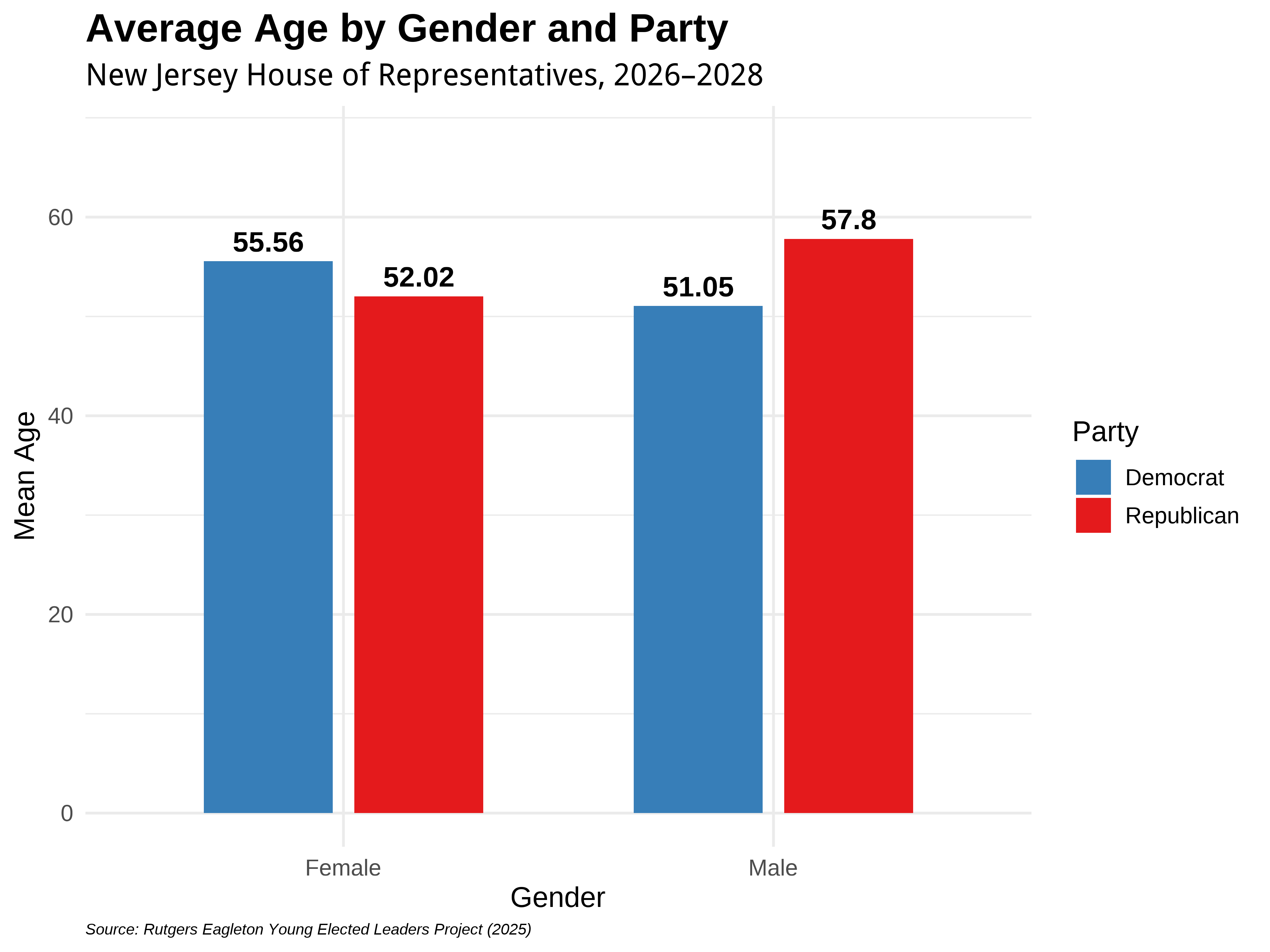When examining both gender and party affiliation, additional age differences emerge within the New Jersey General Assembly. Among women legislators, Democratic members have an average age of 55.56, compared to 52.02 for Republican women. Among men, however, the pattern reverses: Republican men have the highest average age at 57.8, while Democratic men average 51.05. These differences illustrate how age representation in the Assembly varies across both gender and partisan lines, suggesting distinct generational dynamics within each party’s legislative cohort.