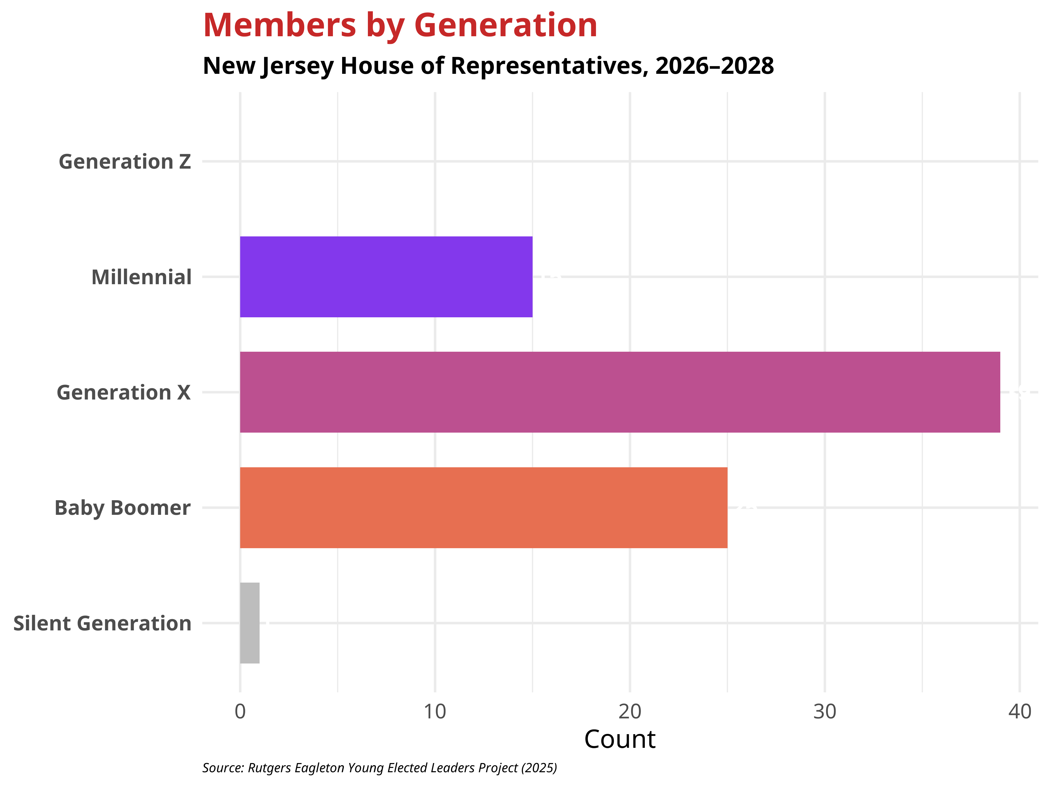 Within the New Jersey House of Representatives, most representatives come from the Millennial, Generation X, or the Baby Boomer generations. Scroll below to view the generations represented in the New Jersey House of Representatives.