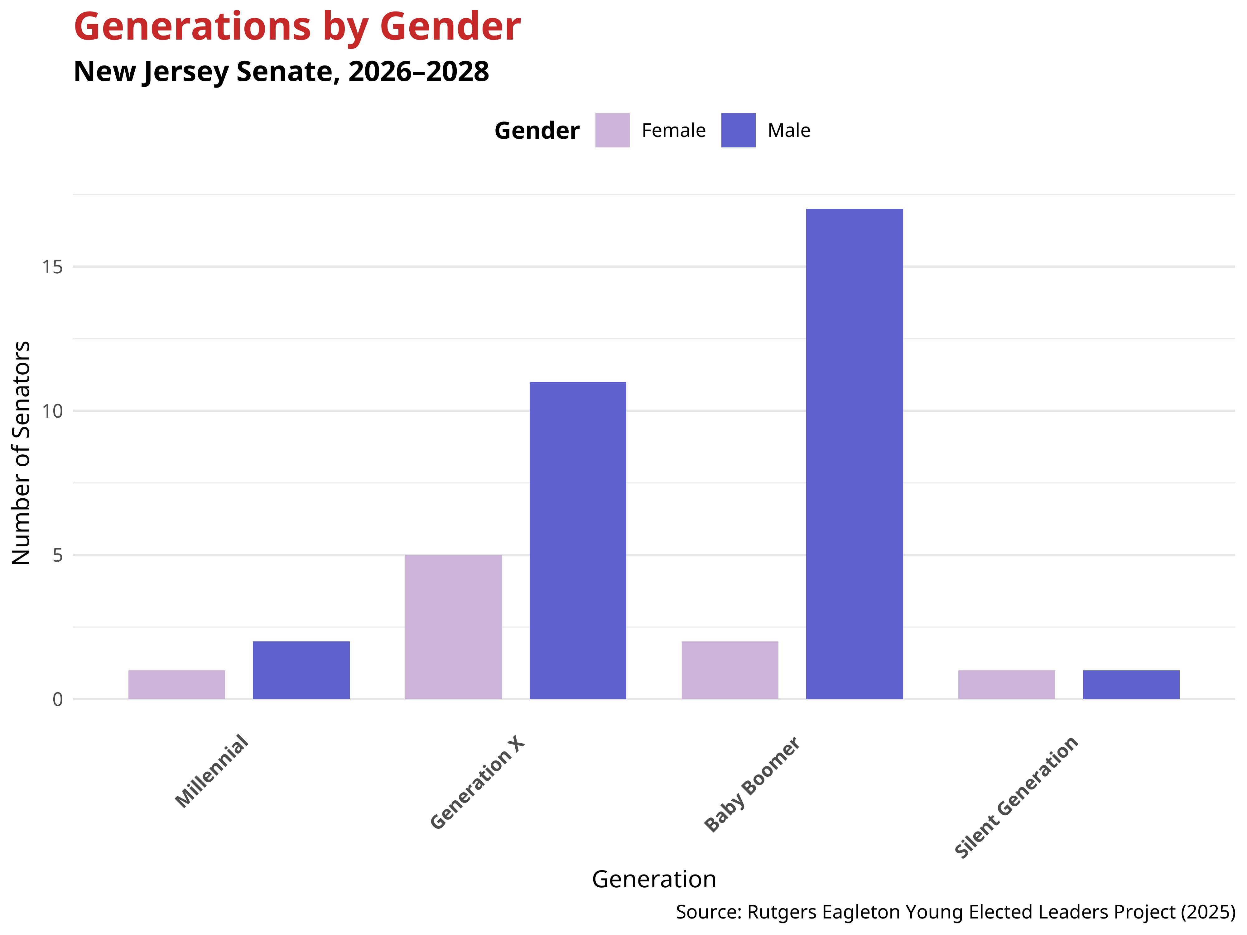 The generational makeup of the New Jersey Senate reveals notable gender dynamics. Overall, men are overrepresented across all age groups, especially among older generations. These patterns indicate that gender representation varies across generations, with women being represented in every generational cohort.
