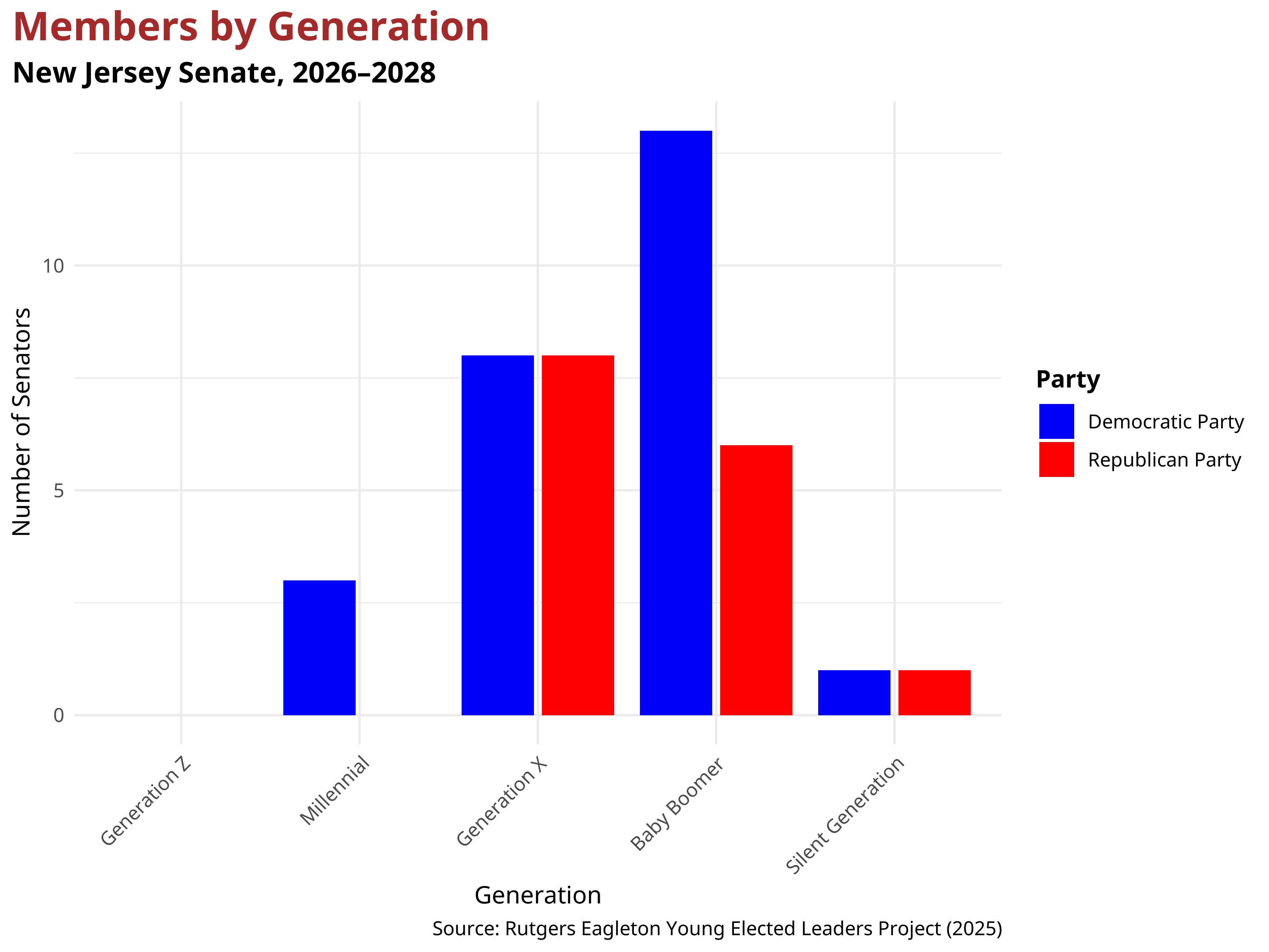 In the New Jersey State Senate, 15 senators are Republicans, and 25 are Democrats. Following the 2025 election, the average age of Democratic senators was 60.99, while Republican senators had a slightly higher average age of 61.62, reflecting only a modest partisan age gap. Despite this similarity, the chamber’s overall generational profile remains concentrated among Baby Boomers and Generation X members, with little to no representation from younger cohorts. The breakdown below illustrates how party affiliation is distributed across generations within the New Jersey State Senate.