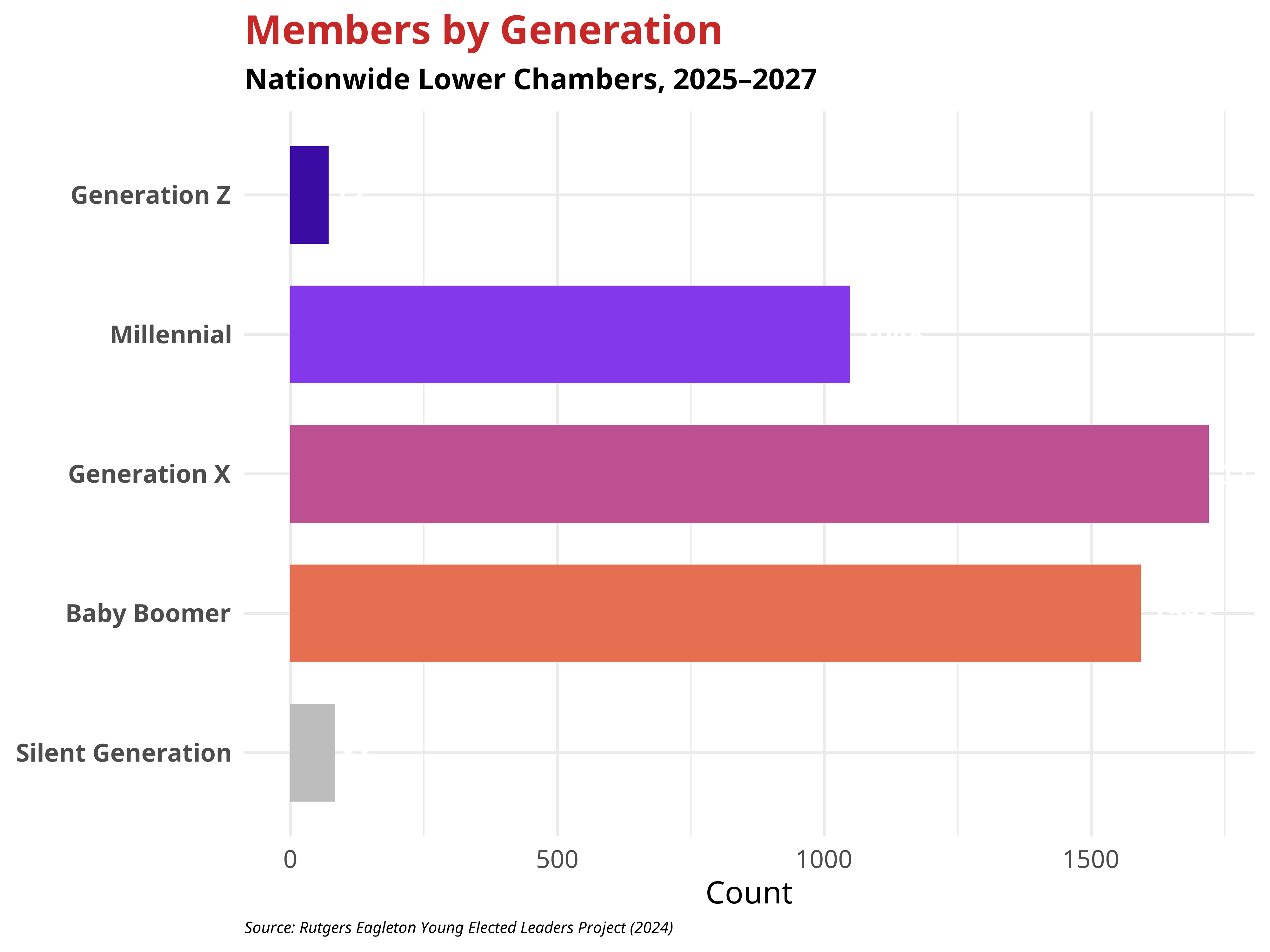 Within lower state legislative chambers, most representatives come from the Millennial, Generation X or The Baby Boomer generation. Importantly, only a few members of these current bodies belong to Generation Z. Scroll below to see the generations in the states visualized.