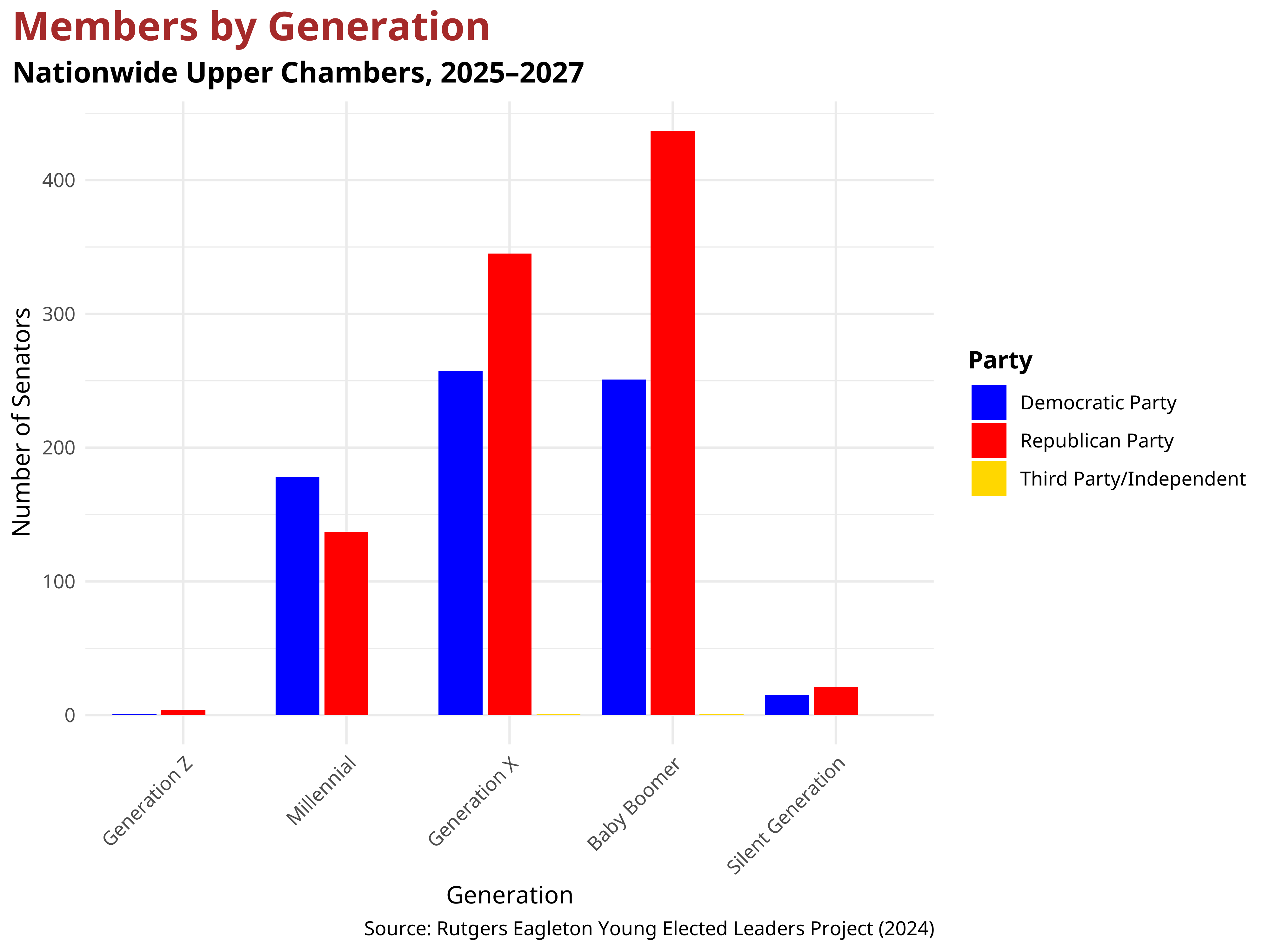 - Currently, 88 members of upper state legislative chambers are Young Elected Leaders, aged 35 or younger as of Election Day 2024